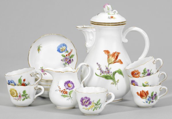 Mokkarestservice mit Blumendekor 8-tlg.; Kaffeekanne, Sahnegießer, 6 Tassen mit Untertassen. Feine, polychrome Blumenmalerei mit Goldstaffage. Minim. best.; Schwertermarke. Kannen-H. 22 cm.