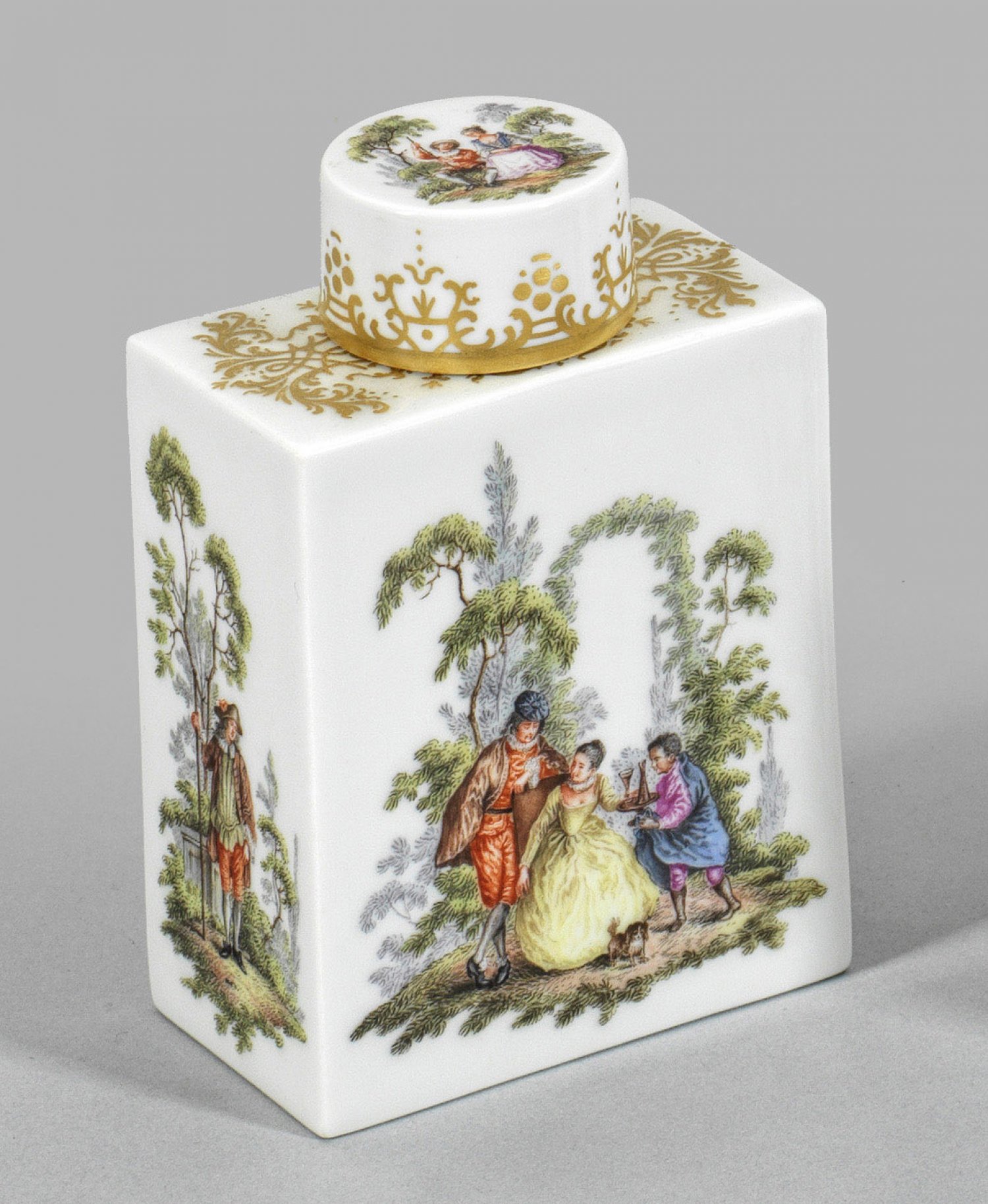 Teedose mit Watteauszenen Rechteckiger Korpus mit kurzem, zylindrischem Hals und übergreifendem Deckel. Auf der Wandung und dem Deckel galante Watteauszenen in feiner polychromer Malerei. Reicher Golddekor aus Laub- und Bandelwerk. Schwertermarke. H. 10 cm.