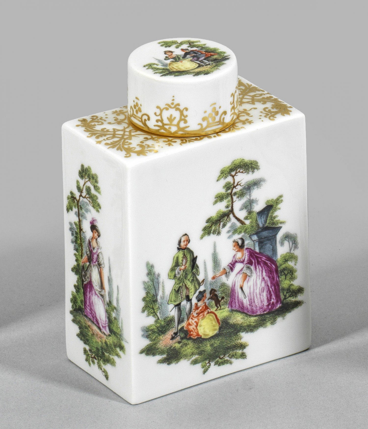 Teedose mit Watteauszenen Rechteckiger Korpus mit kurzem, zylindrischem Hals und übergreifendem Deckel. Auf der Wandung und dem Deckel galante Watteauszenen in feiner polychromer Malerei. Reicher Golddekor aus Laub- und Bandelwerk. Schwertermarke. H. 10,5 cm.