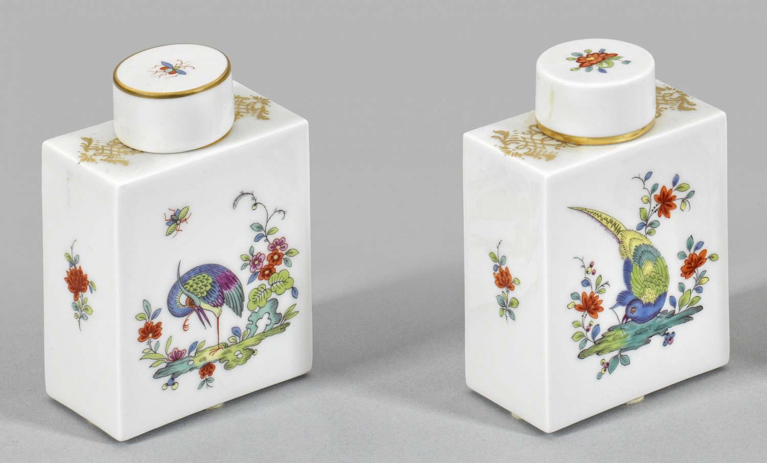 Paar Teedosen mit Kakiemondekor Rechteckiger Korpus mit kurzem, zylindrischem Hals und übergreifendem Deckel. Auf der Wandung und dem Deckel farbenprächtige Vogeldarstellungen. Feine polychrome Malerei im Kakiemonstil. Reicher Golddekor aus Bandelwerk. Schwertermarke. H. 10,5 cm.