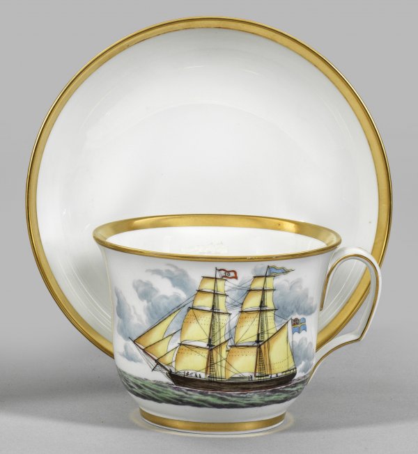 mit Untertasse. Schauseitige Darstellung der 1846 in Gefle erbauten Brigg ALFHILD von 299 RT in feiner polychromer Malerei. Goldrand. Limitierte Auflage 22/300. Originalkarton. Schwertermarke. H. 8 cm.