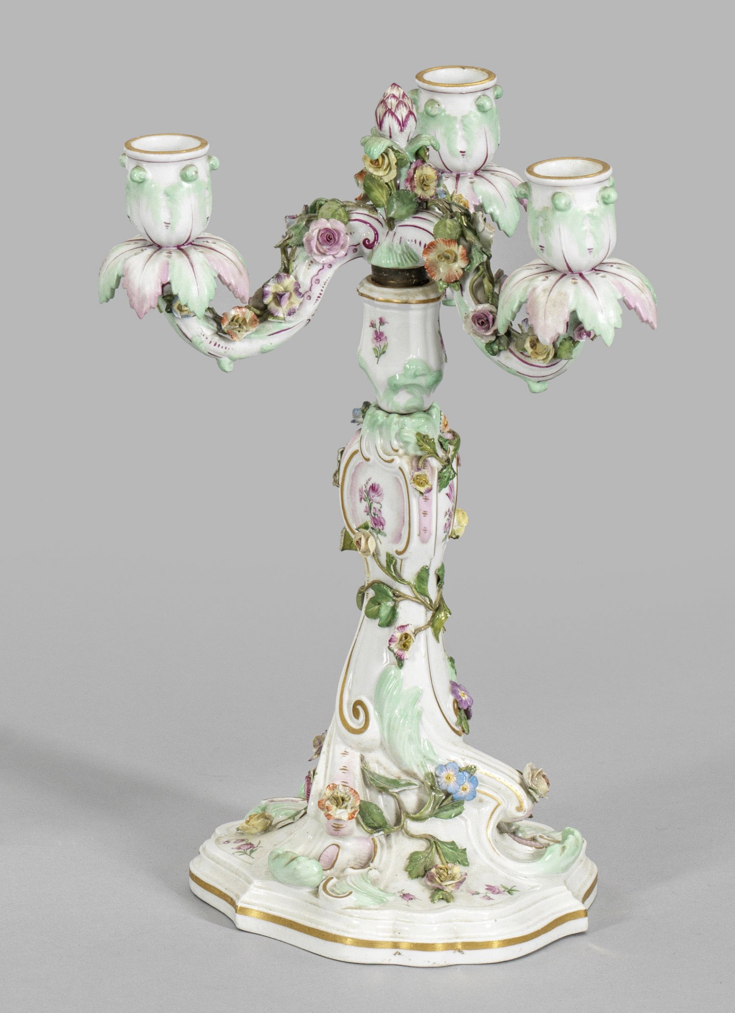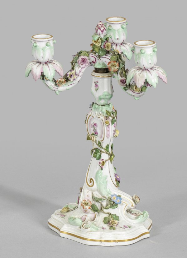 Girandole mit Blumendekor 1- bzw. 3-flg.; Über passig geschweiftem, getrepptem Sockel volutenförmig aufsteigender, von plastisch aufgelegten Blüten- und Blattranken umzogener dreiseitiger Balusterschaft. Abnehmbarer, dreiarmiger Leuchteraufsatz mit vasenförmigen Tüllen über Traufschale. Umlaufend feine Blumenbuketts. Polychrome Malerei mit Goldstaffage. Best.; Schwertermarke. H. 30 cm.