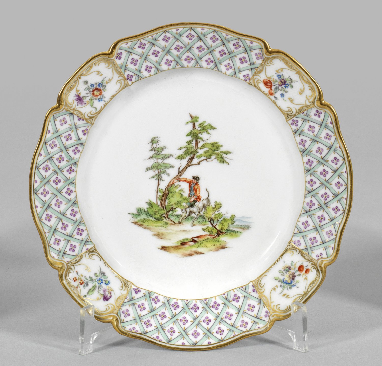 Zierteller mit Jagdmotiv Runde, leicht vertiefte Form. Im Spiegel Landschaftsszene mit Jäger und Hund. Auf der Fahne goldgerahmter Flechtwerk- und Blumendekor. Polychrome Malerei mit Goldstaffage. Manufakturmarke. D. 21,5 cm.