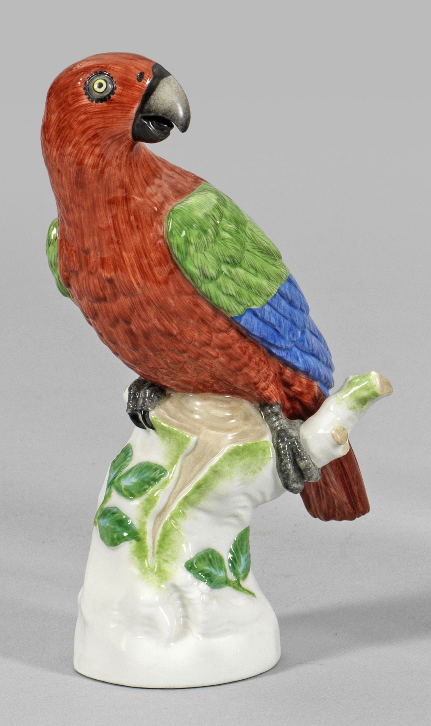 Papagei Auf hohem Baumstumpf sitzender Papagei mit naturalistisch reliefiertem, farbenprächtigem Federkleid. Polychrome Malerei. Manufakturmarke. H. 19,5 cm.