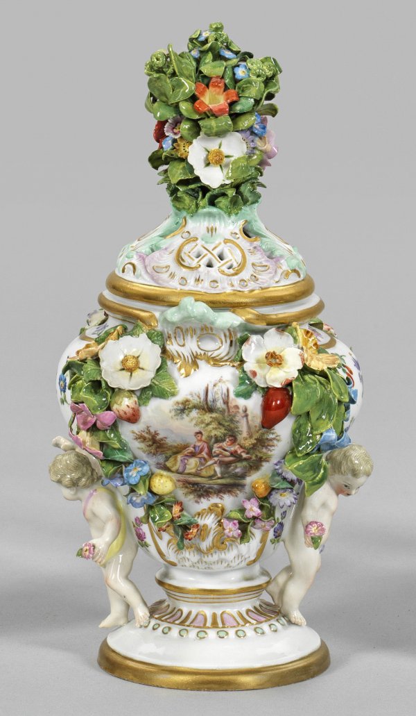 Kleine Potpourrivase mit Watteauszene Balusterform mit seitlich stehenden Amoretten. Durchbrochen gearbeiteter, rocaillereliefierter Deckel mit großem Blumenarrangement. Beidseitig der Wandung von feinen, plastisch aufgelegten Blumenfestons gerahmte Watteauszene bzw. Blumenbukett, umgeben von farbigen Streublumen. Polychrome Malerei mit Goldstaffage. Rest.; Schwertermarke. H. 23 cm.