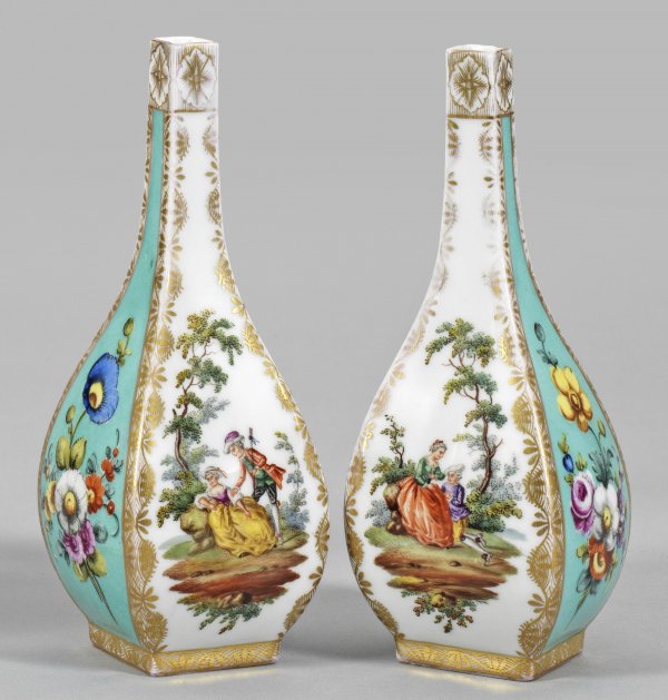 Paar Sakeflaschen mit Watteaudekor Vierkantige Balusterform mit schmalem Hals. Umlaufend von Goldornamentik gerahmte sog. Watteauszenen auf weißem Fond im Wechsel mit Blumenbuketts auf seegrünem Fond. Gold teilw. ber.