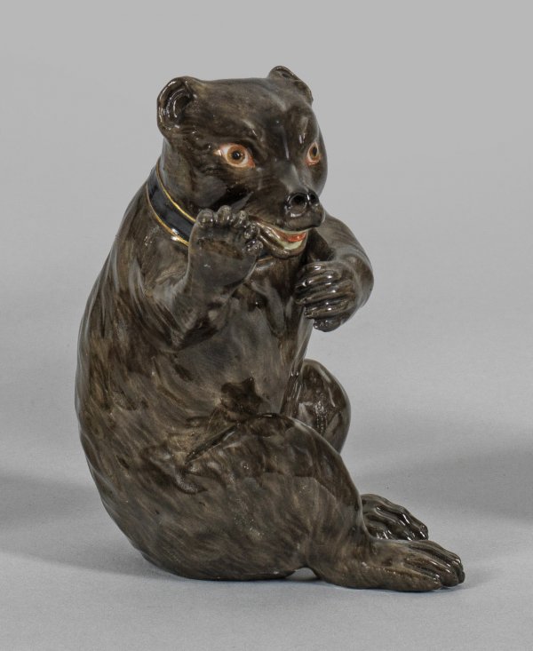Tanzbär Sitzender, junger, nach rechts gerichteter Bär mit braun staffierter, leicht reliefierter Fellzeichnung. Um den Hals ein schwarzes, goldkonturiertes Band gebunden. Polychrome Malerei. Entw. Johann Joachim Kaendler. Schwertermarke. H. 10 cm.