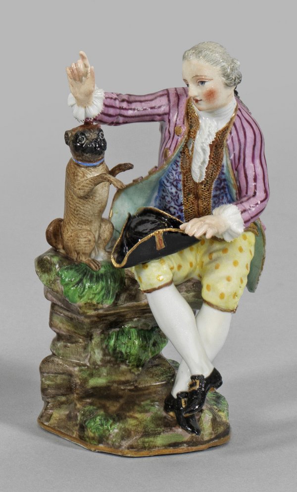 Kavalier mit Mops Auf naturalistischem Felssockel sitzender junger Herr in galanter, spitzenbesetzter Kleidung, mit der erhobenen rechten Hand den seitlich sitzenden, Männchen machenden Mops dressierend. Polychrome Malerei mit Goldstaffage. Entw. Johann Joachim Kaendler und Peter Reinicke. Minim. rest./best.; Schwertermarke. H. 12,5 cm.