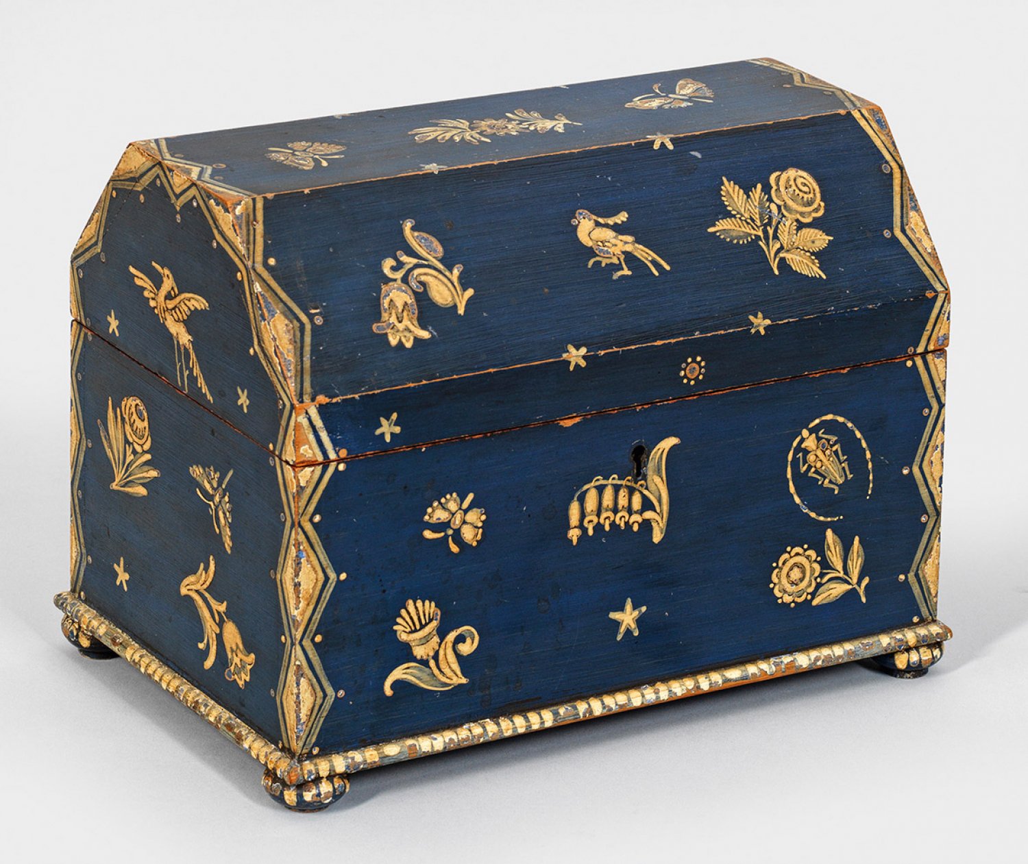 Art Déco-Schatulle Holz mit flächendeckendem blauen Fond sowie cremefarbenen Malereien. Gerader rechteckiger Korpus auf schmaler Zarge und gedrückten Füßen mit gekantetem Deckel. Dekor aus lose gestreuten, stilisiertren Blüten, Vögeln und Insekten, von Zackenbändern begrenzt. Innen herausnehmbare Facheinteilung. Unterhalb undeutl. Etikett. H. 19 cm. 26 cm x 16 cm.