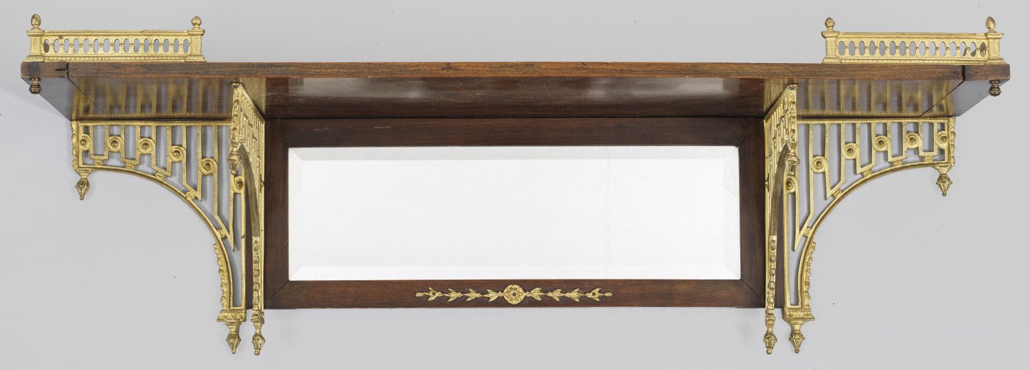 Wandboard im Empire-Stil Holz, mahagonifarben gebeizt und vergoldetes Messing. Verspiegeltes Wandschild und gitterartig durchbrochene Streben als Träger für teilw. galeriegerahmte Deckplatte. H. 24 cm. 80 cm x 20 cm.