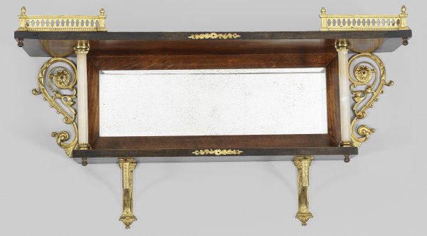 Wandboard im Empire-Stil Holz, mahagonifarben gebeizt, Alabaster und vergoldetes Messing. Verspiegeltes Wandschild und eingerollte Blattvoluten als Träger für teilw. galeriegerahmte Deckplatte und entsprechendes Ablagefach unterhalb. H. 34 cm. 65 cm x 18 cm.