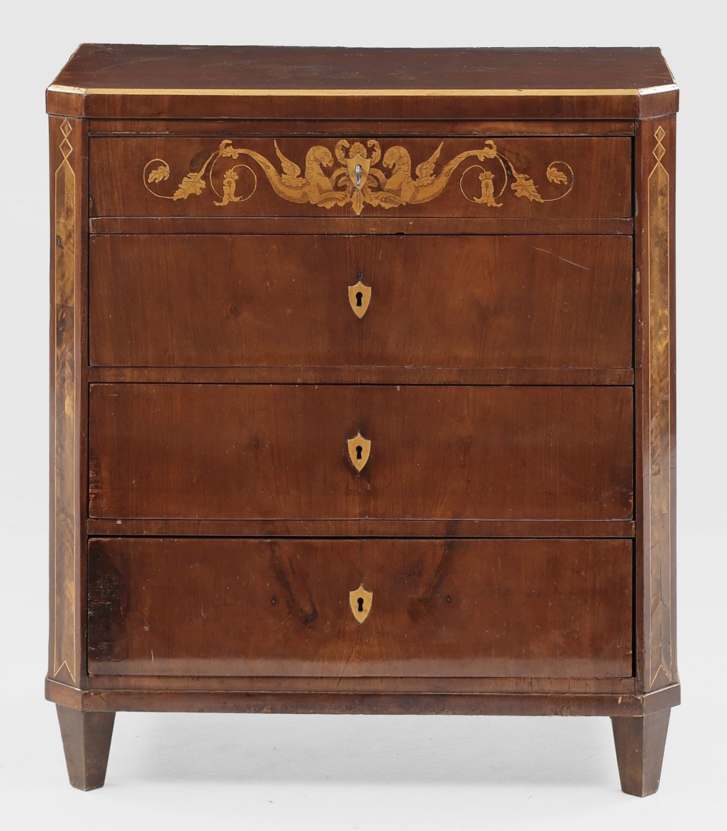 Kleine Biedermeier-Kommode Mahagoni, furniert sowie Einlagen aus Ahorn. Gerader, hochrechteckiger Korpus, flankiert von schräggestellten Ecklisenen auf konischen Vierkantbeinen. In der gegliederten Front vier Schubladen unterschiedlicher Größe, die oberste mit Facheinteilung und pultartig aufstellbarer Arbeitsfläche. Schmale Bandeinlagen sowie eingelegte Chimären mit eingerollten Blattvoluten. Gering überstehende Deckplatte. H. 82 cm. 75 cm x 75,5 cm.