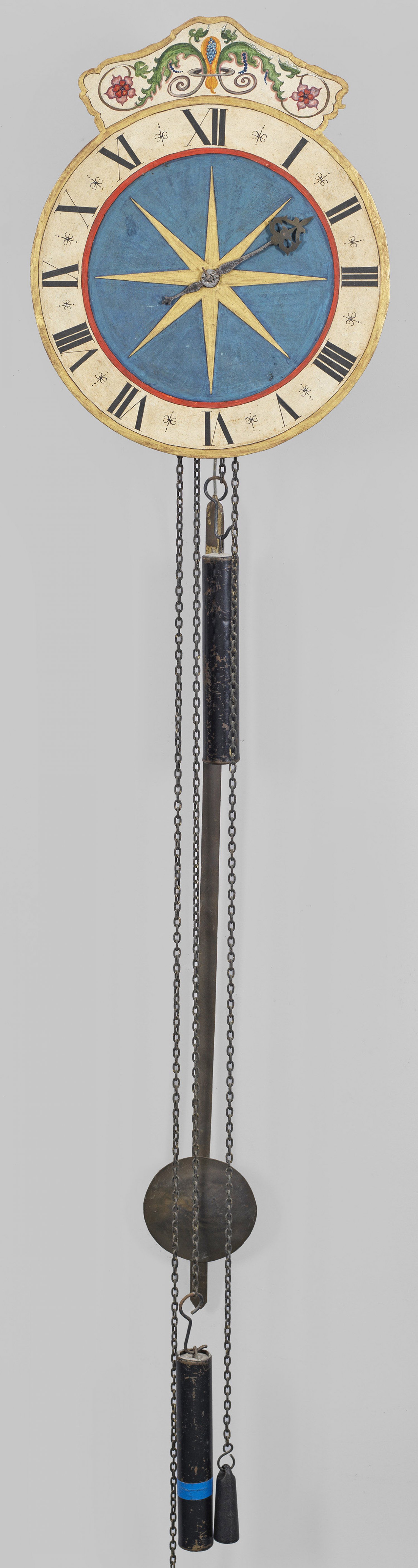 Barock-Wanduhr Eisen, Messing und farbig bemaltes Metall. Rechteckiger, seitlich offener Korpus mit sichtbarem Einzeiger-Räderwerk mit Ankerhemmung. Rundes, rest. Zifferblatt mit großem Stern auf blauem Fond sowie oberem Abschluss mit Blattvoluten. Uhren-H. 34 cm.