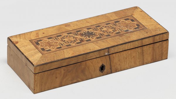 Kleine Biedermeier-Schatulle Nussbaum, furniert sowie Einlagen aus unterschiedlichen Edelhölzern. Gerader, querrechteckig angelegter Korpus mit entsprechendem Flachdeckel. In der Mitte breit gerahmte Reserve mit mosaikartig eingelegten, gedrehten Sternmotiven. H.4,5 cm. 22 cm x 9 cm.
