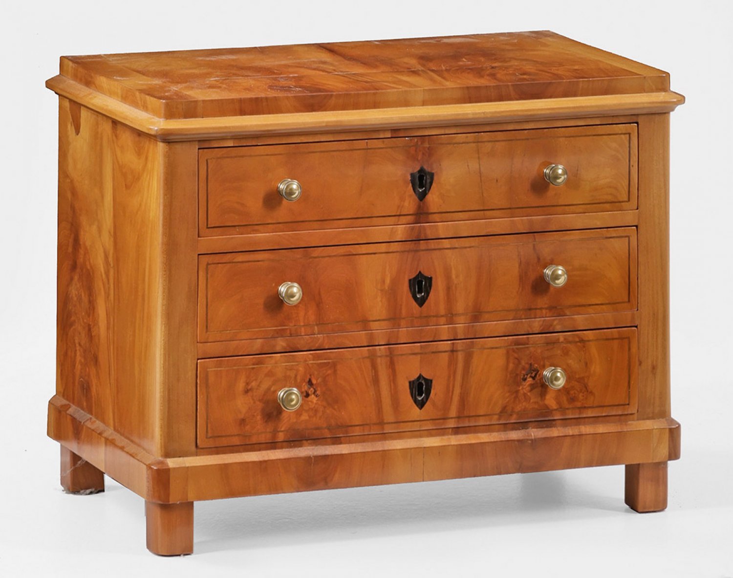 Biedermeier-Modellkommode Kirschbaum, furniert. Gerader, querrechteckig angelegter Korpus auf schmaler Zarge und gekanteten Füßen. In der gegliederten Front drei Schubladen. Profilgerahmte Deckplatte. H. 40,5 cm. 53 cm x 30,5 cm.