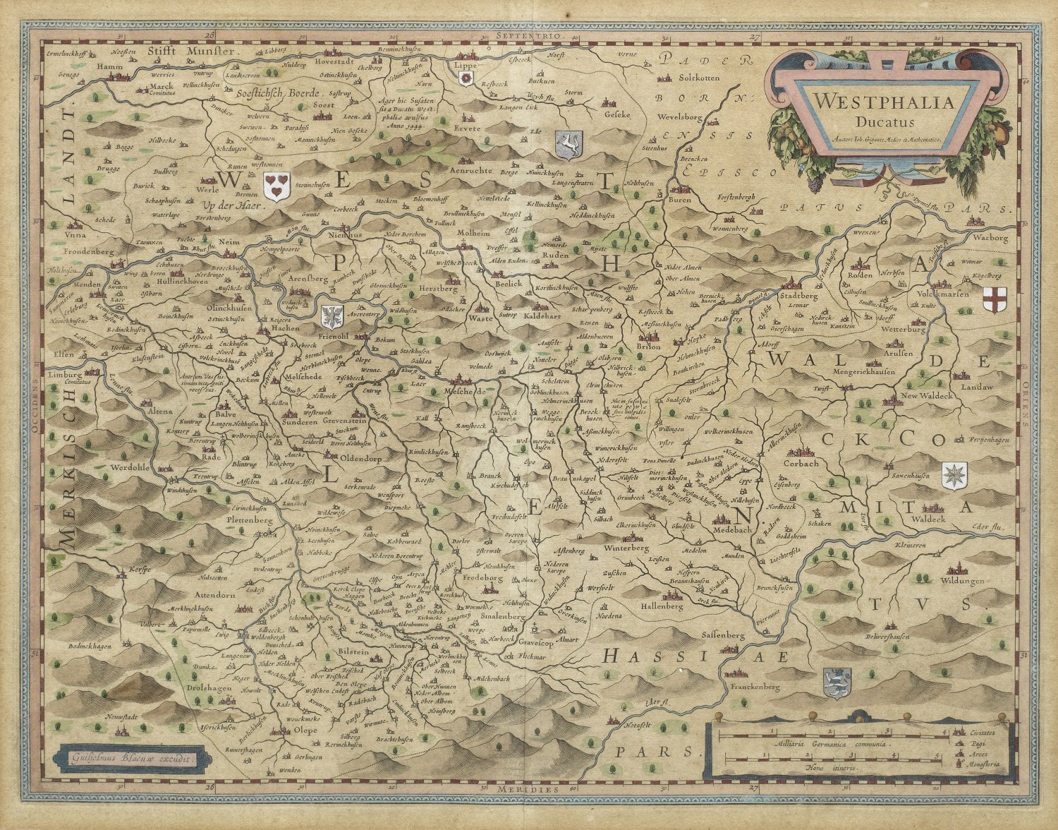 "Westphalia Ducatus". Originaltitel Altkolorierte Kupferstichkarte des historischen Herzogtums Westfalen von Willem Blaeu, Hrsg. W. Blaeu oder J. Blaeu, Amsterdam, um 1635-1665. Gebräunt. Plattenmaß ca. 38 cm x 49 cm. Rahmen.