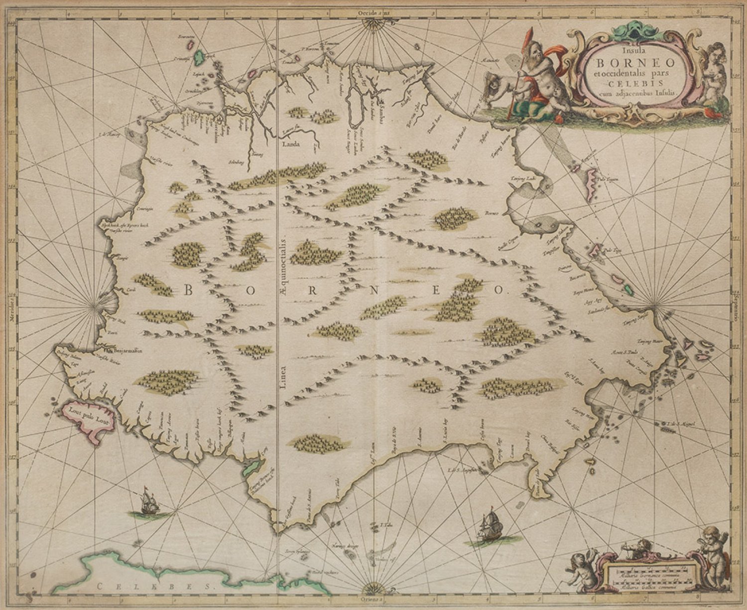 Altkolorierte Kupferstichkarte, Hrsg. J. Janssonius oder von G. Valk und P. Schenk, Amsterdam, um 1660 -1720. Seltene, frühe Borneo-Karte mit dekorativen, figürlichen Kartuschen und Schiffen, die die Insel zwar mit Bergen und Wäldern zeigt, aber außer der Küste mit den Handelsplätzen nichts vom weitgehend unbekannten Inneren. Plattenmaß ca. 42,5 cm x 53 cm. Rahmen.