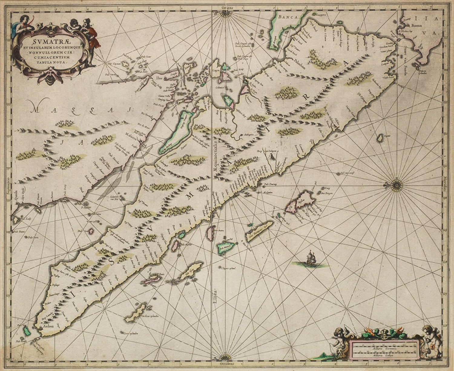 Altkolorierte Kupferstichkarte, Hrsg. J. Janssonius oder von G. Valk und P. Schenk, Amsterdam, um 1660 -1720. Seltene, frühe Karte von Sumatra mit Teilen von Malaysia, Java und Bangka sowie Nachbarinseln. Die Insel wird zwar mit Bergen und Wäldern gezeigt, aber außer der Küste mit den Handelsplätzen wurde nichts vom weitgehend unbekannten Inneren dargestellt. Plattenmaß ca. 42,5 cm x 53 cm. Rahmen.