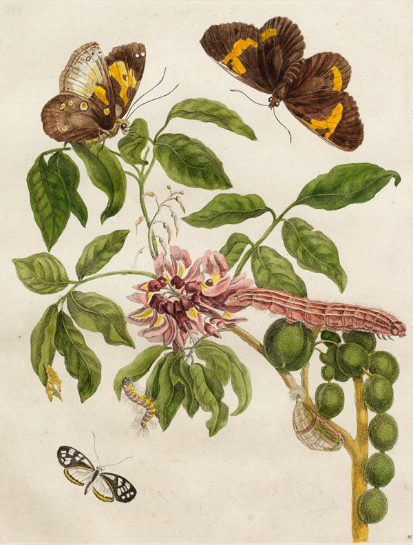 Altkolorierte Kupferstiche von M. S. Merian selbst, J. Mulder und P. Sluyter, 1702-1705. Blatt-Nr. 35 (Sophara-Zweig mit verschiedenen Raupen, Puppe und Schmetterlingen, u. a. von Brassolis sophorae), Nr. 3 (Stachelannone Annona muricata mit Raupe, Puppe und Falter), Nr. 5 (Maniokpflanze mit Entwicklungsstadien eines Falters und Boa), Nr. 15 (Wassermelone mit Raupe und Motte), Nr. 19 (Guajavabaumzweig mit Früchten und Insekten) und 58 ("Zoete Boonen-Boom" mit Insekten). Das Hauptwerk "Metamorphosis insectorum Surinamensium" mit 60 Kupferstichtafeln erschien 1705 erstmals in Amsterdam, die Stiche wurden später in "Dissertatio de generatione et metamorphosibus insectorum Surinamensium" wiederverwendet (mit 12 zusätzlichen Stichen, erschienen in Amsterdam u. Den Haag 1719 bzw. 1726). Der Stich Nr. 35 wird Merian selbst zugeschrieben. Plattenmaß ca. 31,5 cm - 37 cm x 23,5 cm - 29,5 cm. Teilw. gebräunt und im Blattrand fleckig. Ein Blatt gerahmt.