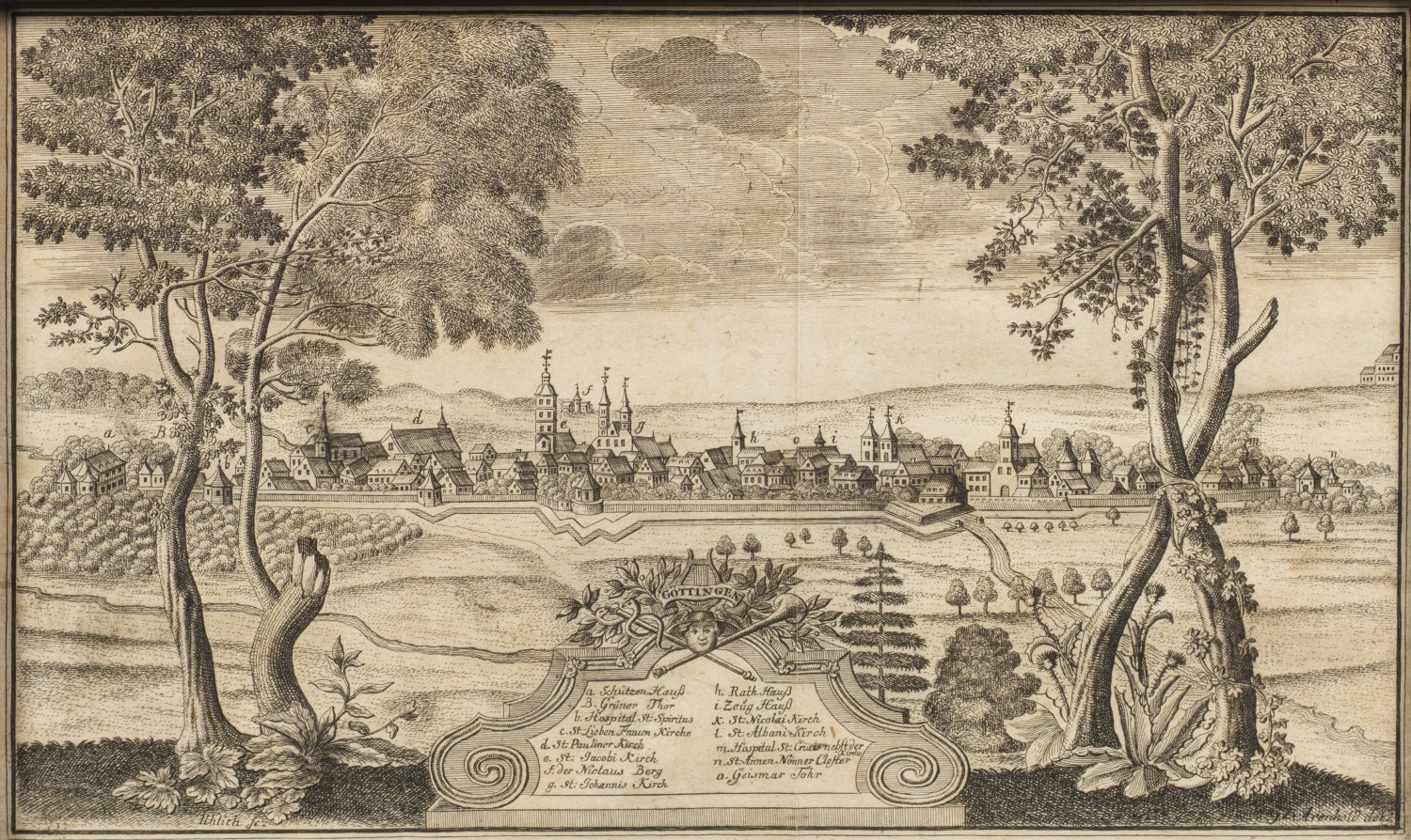A copper engraving with view of Göttingen by Gabriel Uhlich after Gerhard Justus Arenhold, published 1734-1738.