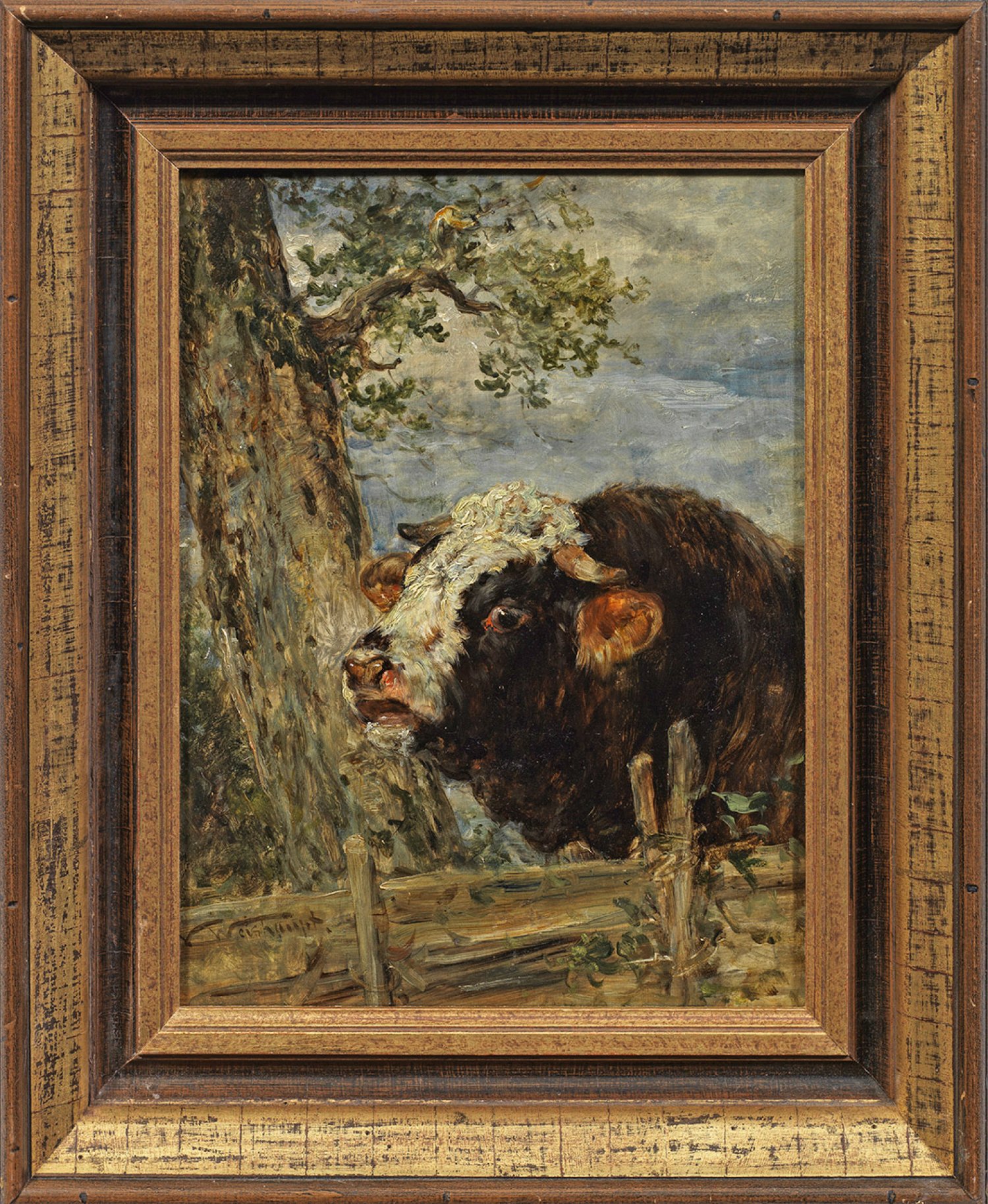 Motiv- und stiltypisches Tafelbild des Tier- und Landschaftsmalers, der im Atelier von Wilhelm von Diez lernte und ab 1885 als Nachfolger Heinrich von Zügels an der Akademie in Karlsruhe unterrichtete. Weißhaupt stellte oft aus und wurde 1876-1881 u. a. in London, Düsseldorf, Berlin und München mit Medaillen ausgezeichnet. Zu den vergleichbaren Werken Weißhaupts zählt das 1879 entstandene bekannte Gemälde "Wilder Stier". Öl/Holztafel. L. u. sign.; 35 cm x 27,2 cm. Rahmen.