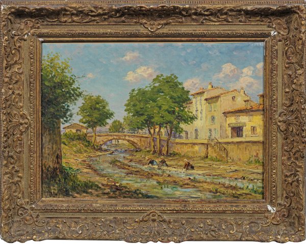 Spätimpressionistische, charakteristische Landschaft des Künstlers, der an der École des Beaux-Arts in Paris studierte. Mit Vorliebe malte er die Mittelmeerorte, Küsten und Häfen im Département Bouches-du-Rhône (Sausset les Pins, Martigues, Cassis) sowie Motive an der Var, Landschaften von Paris und an den Seine-Ufern. Bis 1934 stellte Malfroy regelmäßig in Paris im Salon des Artistes Français und Salon des Indépendants aus. Öl/Lwd., doubl.; L. u. sign.; 46 cm x 65,5 cm, Rahmen.
