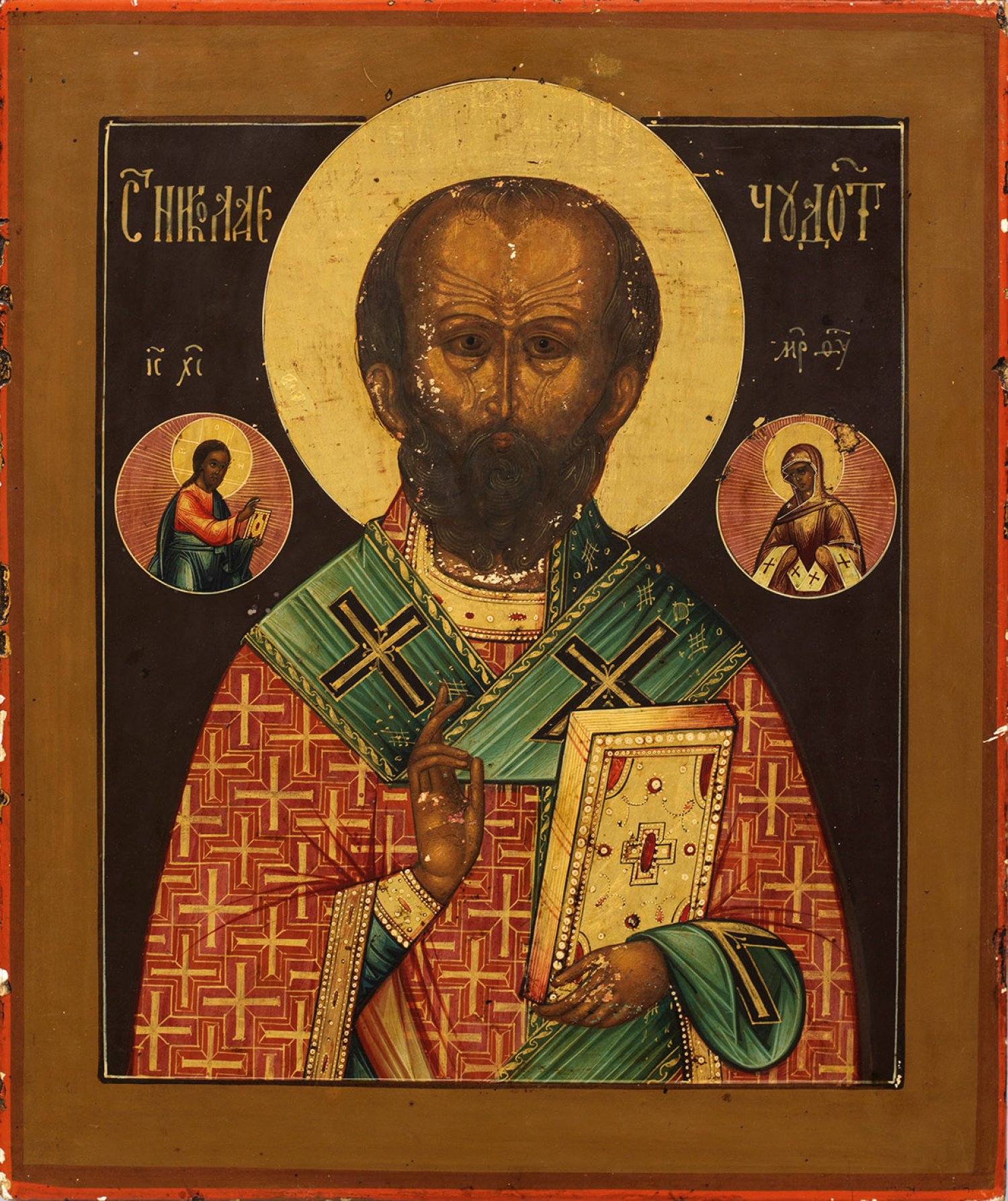 Ikone "Hl. Nikolaus der Wundertäter" Tempera mit Gold auf Holz. Halbfigurige Darstellung des Heiligen Nikolaus im Bischofsgewand mit Nimbus. Die rechte Hand zum Segensgestus erhoben, in der Linken das geschlossene Evangelienbuch haltend. Seitliche Medaillons mit Christus und Gottesmutter. Kirchenslawisch bez.; Teilw. ber./best.; 31 cm x 26 cm.