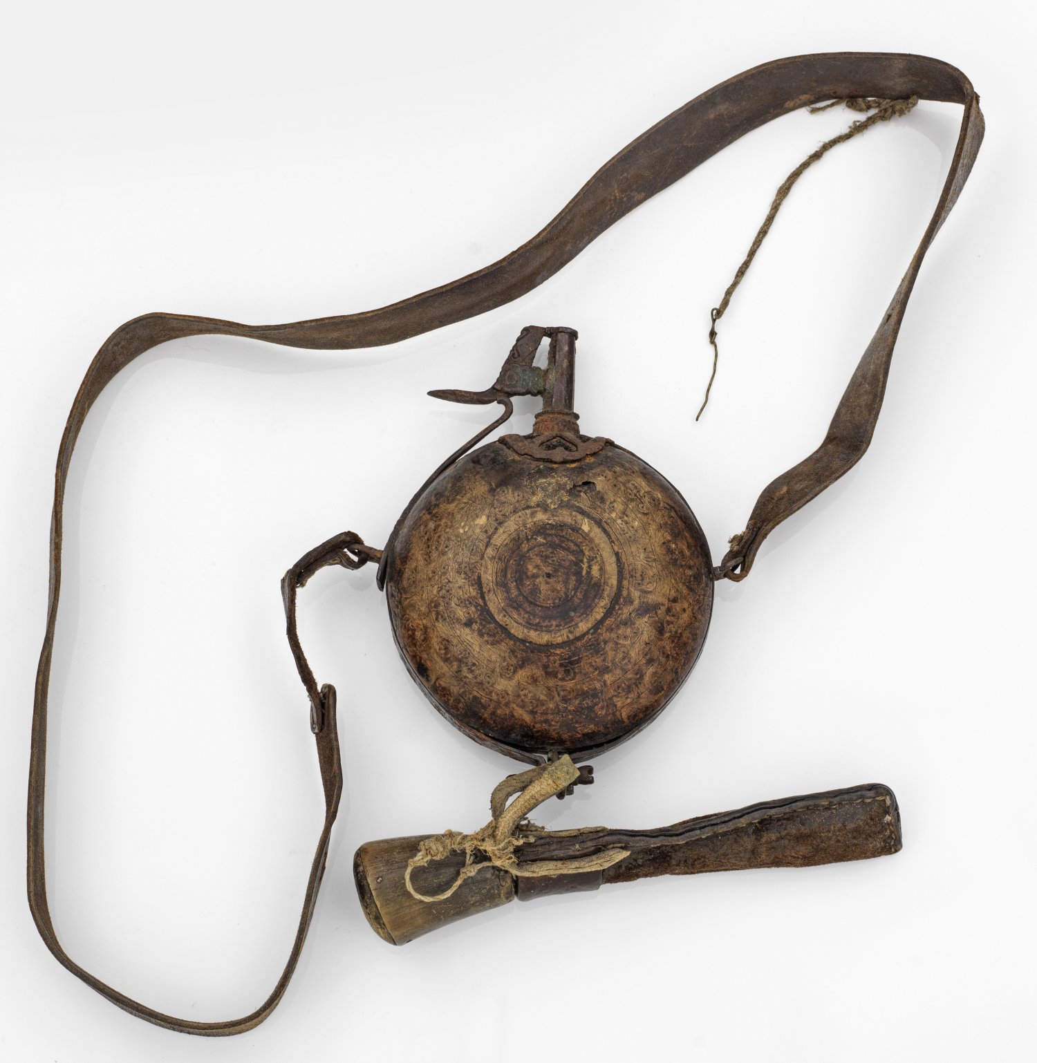 Pulverflasche Wurzelholz, gedrechselt. Eisen, Horn, Leder. Runder, leicht bombierter Korpus mit konischer Schütte. Eisenmontierung und gefederter Verschluss. Seitliche Trageösen. Ergänzter Lederriemen und Pulvermaß mit Stopfen. Gebrauchsspuren, teilw. besch. D. 13,5 cm.