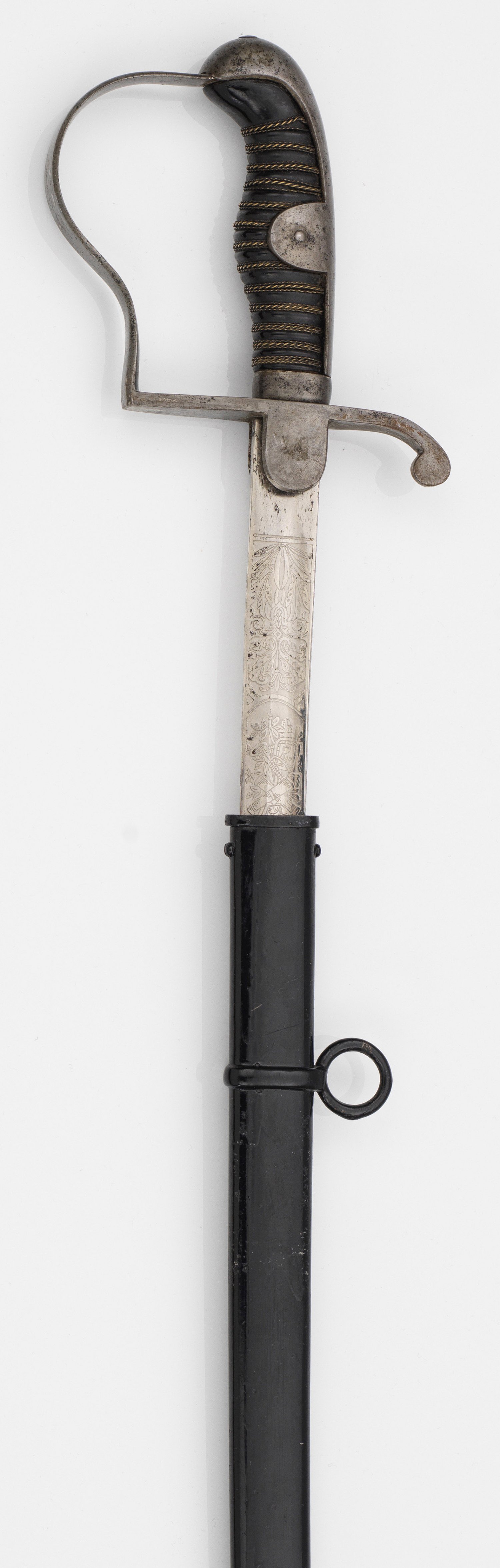 Beidseitig gekehlte, vernickelte bez. Rückenklinge mit Trophäen und Schlachtendarstellung. Auf dem Rücken bez. "W. Baumeister Ludwigsburg". Stahlgefäß mit Kunststoffhilze und Drahtumwicklung. Schwarz lackierte Metallscheide. Säbel-L. 95,5 cm.