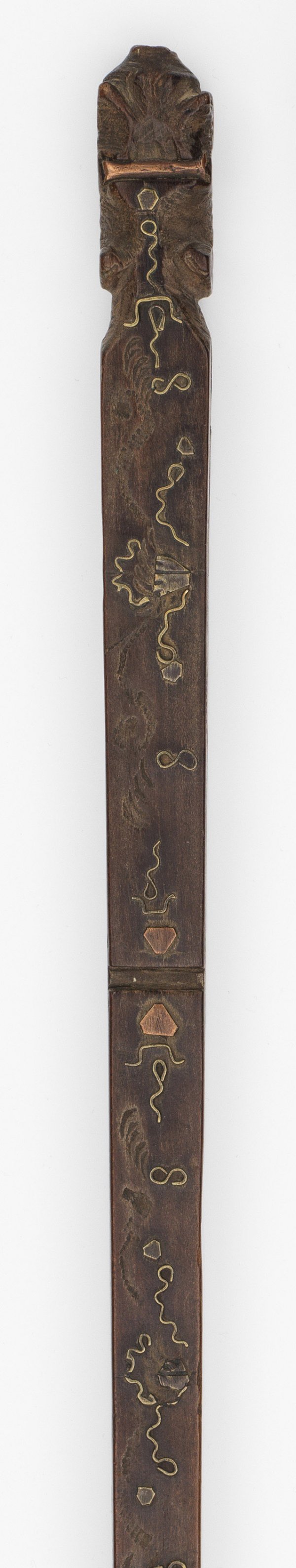 Schneider-Elle Holz. Vierkantig, konisch zulaufend. Obenauf eine geschwungene, abstrakte Schnitzarbeit. Schau- und rückseitiger Dekor aus eingelegten Messing- und Kupferdrähten. Umlaufend im Strich- und Punktedekor geschnitzte Voluten. Rückseitig dat. 1799. L. 68,5 cm.