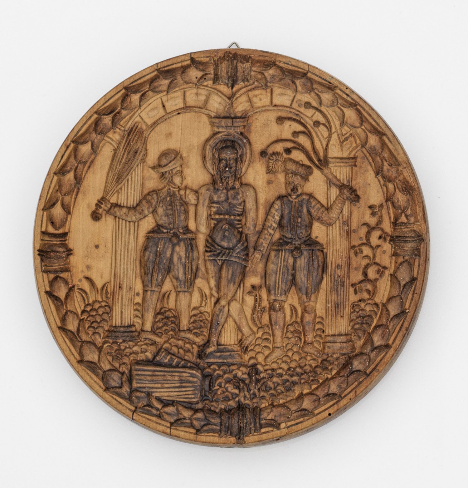 Backmodel mit der Geißelung Christi Holz, geschnitzt. Runde Form. Zentrale Darstellung Christi mit Heiligenschein, lediglich mit einem Tuch um die Hüften bekleidet, gerahmt von zwei uniformierten Männern mit Peitschen in den Händen. Im Hintergrund mehrere Säulen und Blattranken. Umgeben von einem gebundenen Lorbeerkranz. Altersgemäße Gebrauchsspuren. D. 16 cm.