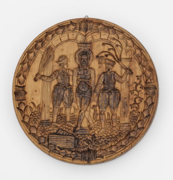 A South German carved wooden baking mold with the scourging of Jesus Christ. Age-related signs of use.