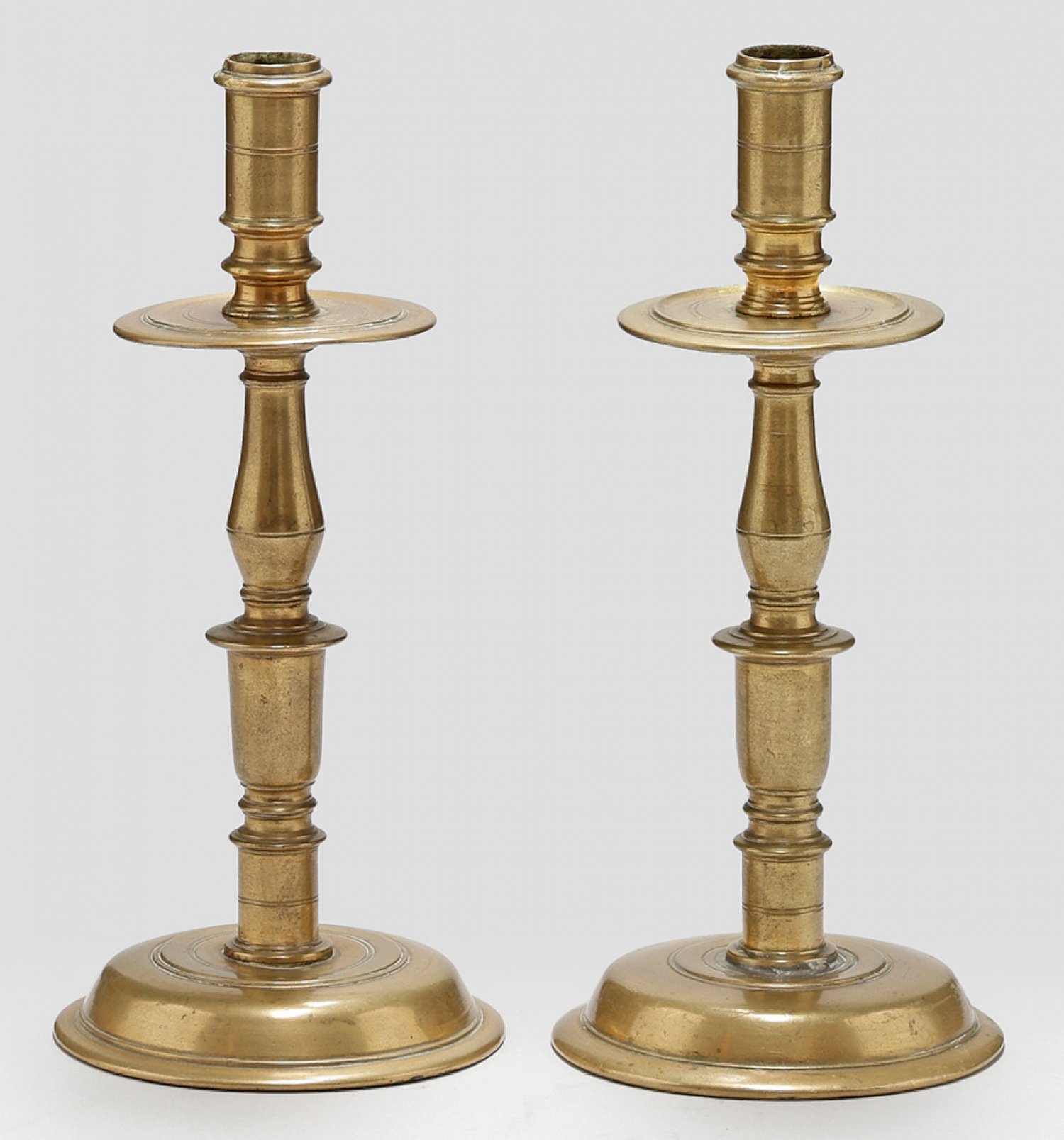 Paar Kragenleuchter 1-flg.; Gewölbter, runder Sockel. Schlanker, in zylindrische Tülle übergehender Balusterschaft mit mehreren flachen Nodi. Unterteilt durch breite, flache und profilierte Traufschale. Minim. best.; H. 27 cm.