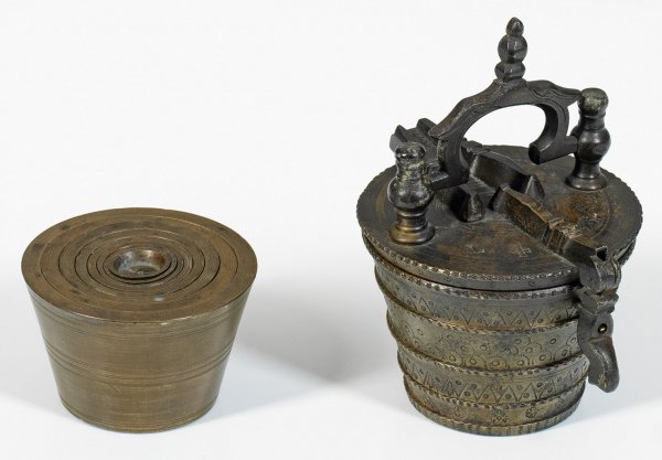 Nürnberger Einsatzgewicht 4 Pfund. Bronze. Konischer, von schmalen Profilbändern und Ornamentfriesen unterteilter Korpus. Auf flachem Deckel Überfalle und beweglicher Bügelgriff. Innen acht Einsatzgewichte (das kleinste fehlend). Gest. Nürnberger Stadtmarke, unbekanntes Meisterzeichen. H. 9 cm.
