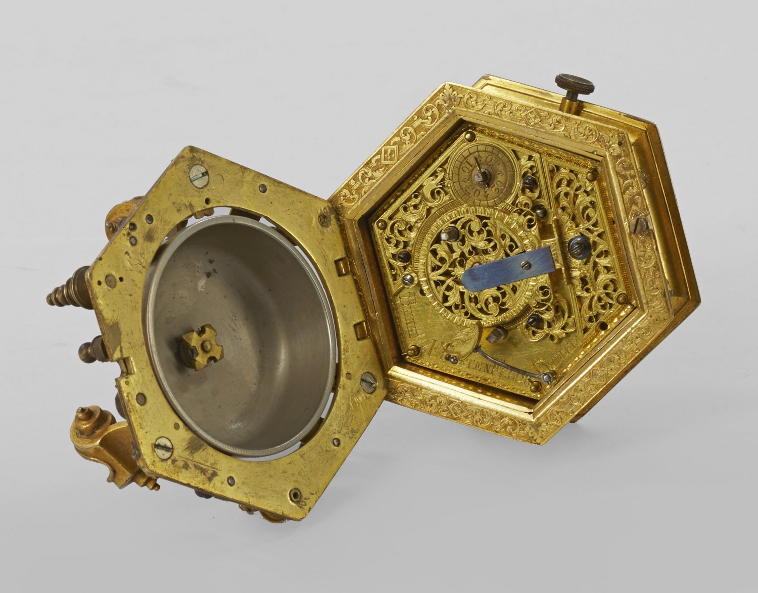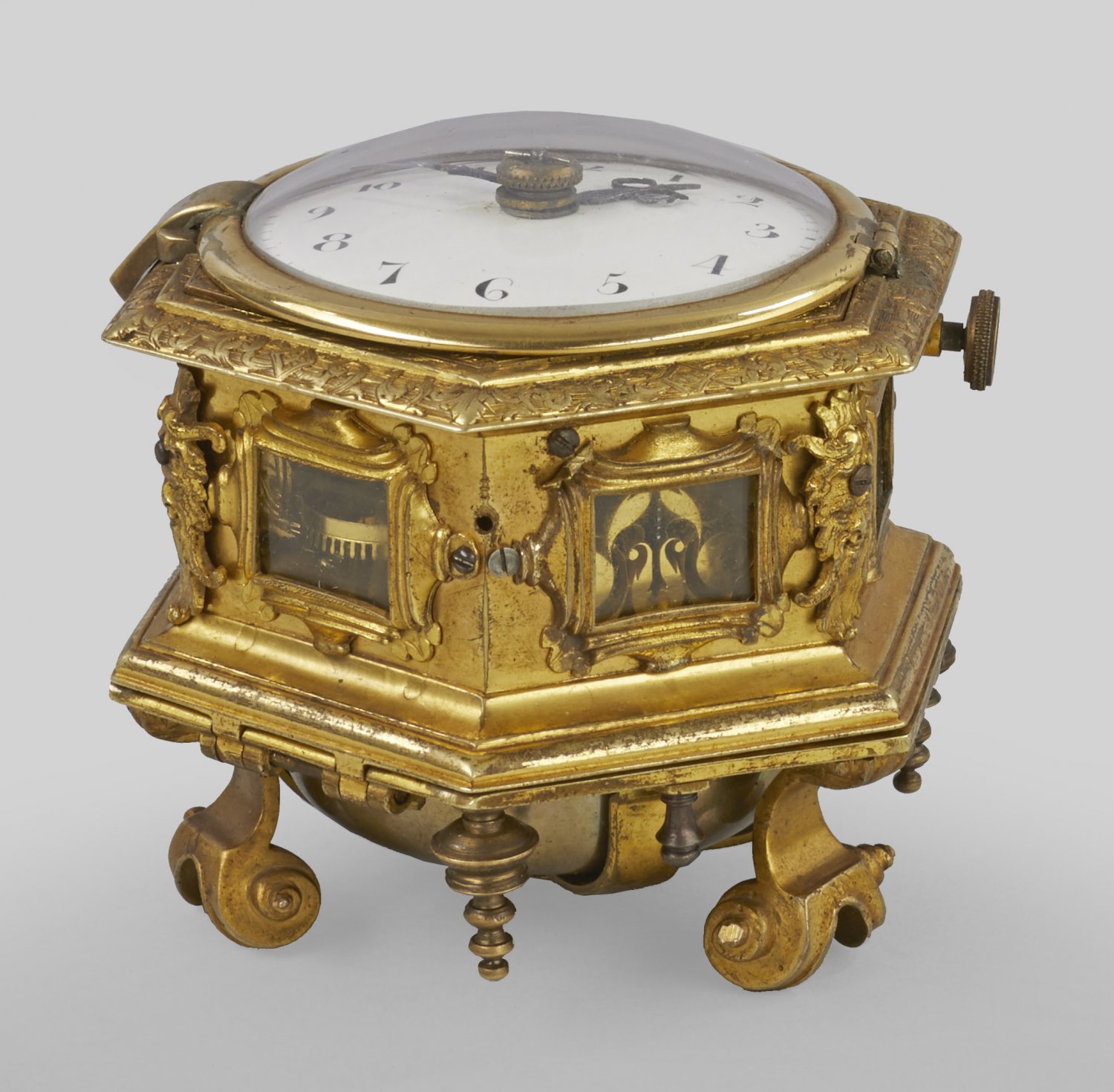 Bronze, vergoldet. Hexagonales Uhrengehäuse auf profilierter Basis mit stark eingezogenen, eingerollten Voluten und mehrfach gegliederten Balusterbeinen. Umlaufend kartuschenförmig gerahmte Glasscheiben, teilw. begleitet von erhaben reliefierten Fratzenmotiven. Korrespondierender oberer Abschluss mit feiner Ziselierung aus Blattmotiven auf fein gestreiftem Fond. Verglastes, weißes Emailzifferblatt mit arabischen schwarzen Zahlen. Werk mit Spindelhemmung, Kette und Schnecke sowie Stundenschlag auf Bodenglocke und aufwändigen Dekokrationen aus durchbrochen gearbeiteten und ziselierten Blattvoluten. Bez. BENE FIRSTENFELDR FRIDBERG. Teilw. Erg. aus dem 19. Jh.; H. 7,5 cm. D. 8,5 cm.