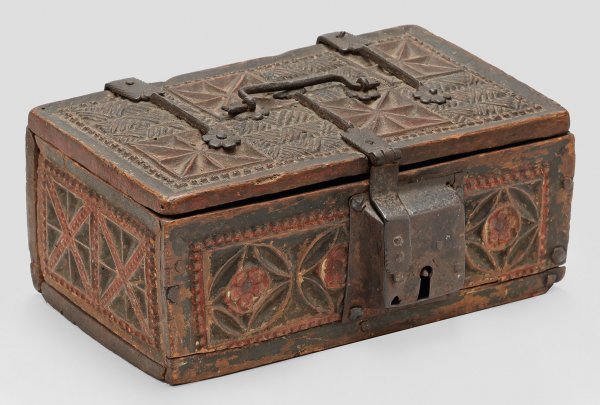 Gotisches Kästchen mit Kerbschnitzerei Holz, geschnitzt, mit Resten farbiger Fassung. Querrechteckiger Korpus mit flachem Scharnierdeckel. Schauseitiges Schloss mit Überfallriegel. Allseitig flächendeckender Dekor aus großen Rosettenmotiven und quadratischen Flächen in geometrischer Kerbschnitzerei. Beschlag aus dünnen, bügelähnlich umgelegten, geraden Eisenstreben mit blütenförmigen Abschlüssen sowie beweglicher Tragegriff. Innen Farbreste einer roten, rautenförmigen Bemalung. H. 26 cm. 38 cm x 27 cm.