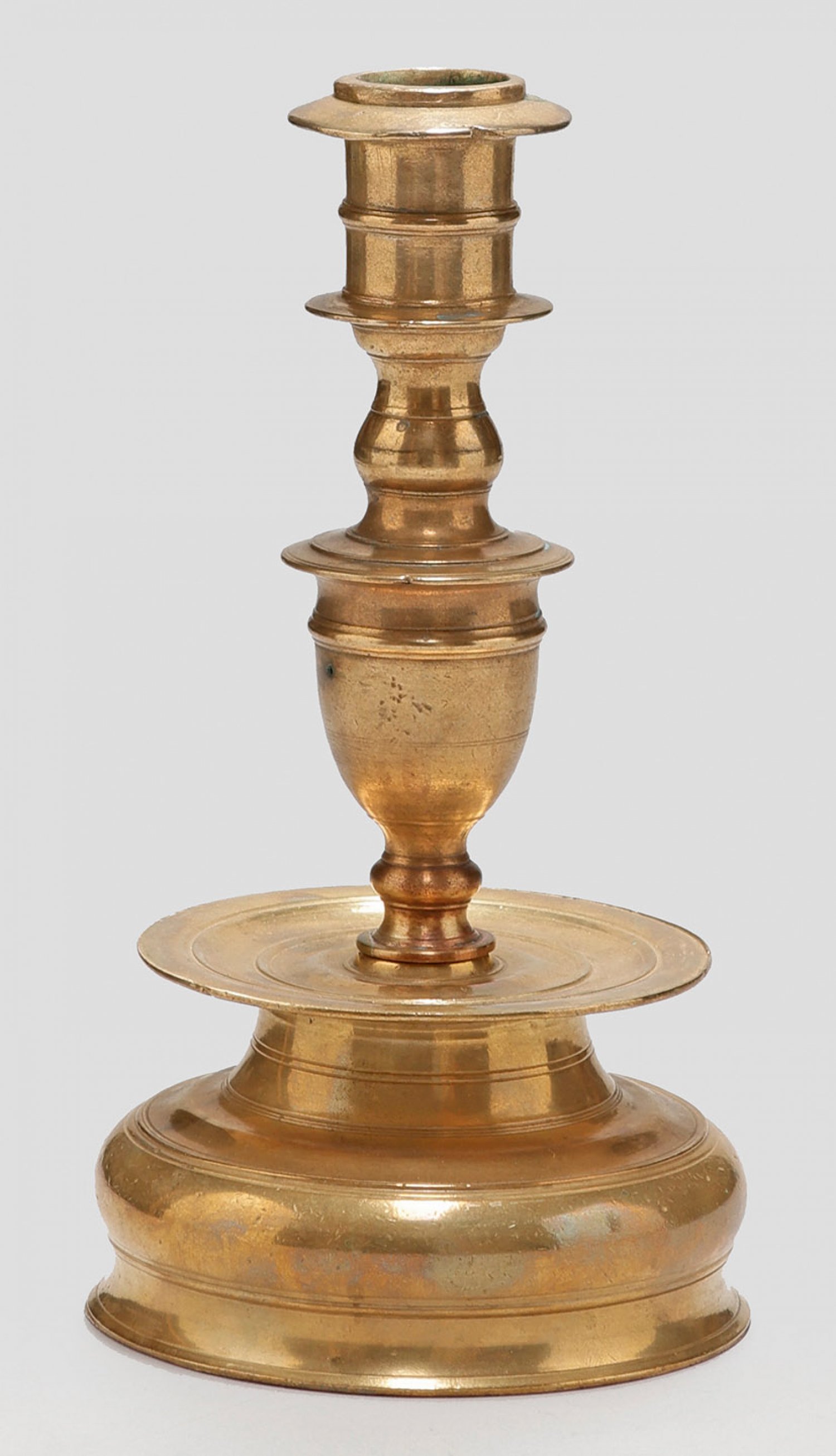 Barocker Glockenleuchter Messing. Glockenförmig aufgewölbter Stand. Über flacher, breiter und profilierter Traufschale ein schraubbarer, mehrfach gegliederter, schlanker Balusterschaft mit zylindrischer Tülle. Altersbedingte Gebrauchsspuren, teilw. rest. H. 22,5 cm.
