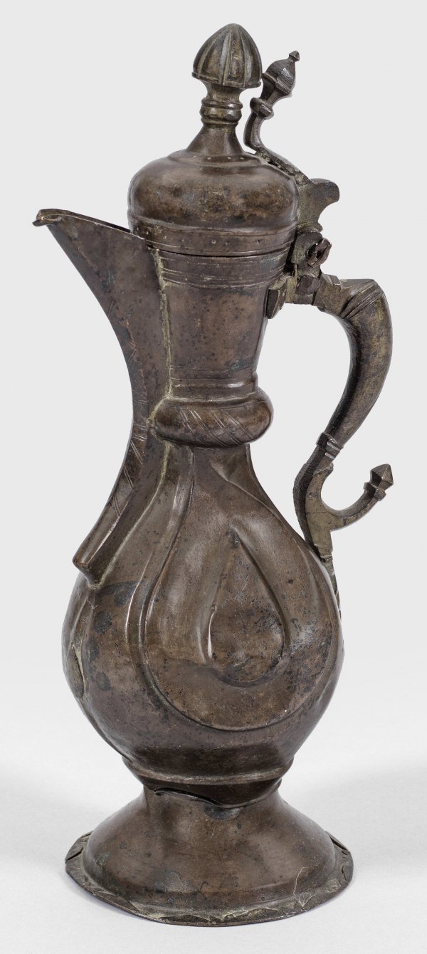 Deckelkanne Messing, dunkel patiniert. Über einem runden, leicht gewölbt ansteigenden Stand ein birnförmiger Korpus mit reliefplastisch tropfenförmigem Dekor. Darüber ein schlanker, sich zum Rand erweiternder, profilierter Kannenhals mit einem kantigen, aufgesetzten Schnabelausguss. Gewölbter Scharnierdeckel mit großem Balusterknauf. Der geschwungene Henkel in eine ebenfalls balusterförmige Daumenrast auf dem Deckel auslaufend. Altersbedingte Gebrauchsspuren, teilw. besch.; H. 29 cm.