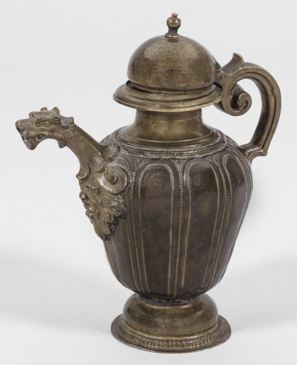 Barock-Kanne Messing und Bronze. Gegossen und abgedreht. Über gedrungenem und aufgewölbtem Stand ein konischer, glatter Korpus mit vertikal länglichen Godronen übergehend in einen kurzen, profilierten und zum Rand hin weit ausschwingenden Kannenhals. Darüber ein bombiert gewölbter, gehämmerter Scharnierdeckel mit kleinem Balusterknauf. Am Henkelansatz ein reliefplastisch aufgesetzter Maskaron übergehend in einen kurzen, in Voluten geschwungenen Henkel mit flacher Daumenrast auf dem Deckel. Der Ausguss am Ansatz ebenfalls mit einem Maskaron verziert und in einem vollplastisch gestalteten Löwenkopf mit geöffnetem Maul endend. Deckel wohl ergänzt. Minim. altersbedingte Gebrauchsspuren. H. 23,5 cm.