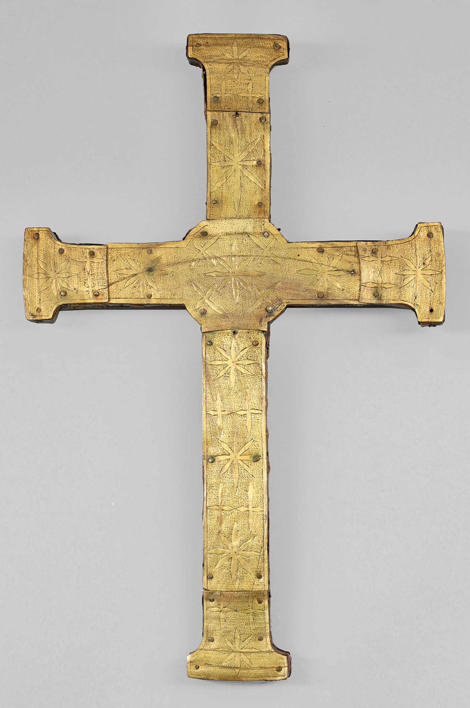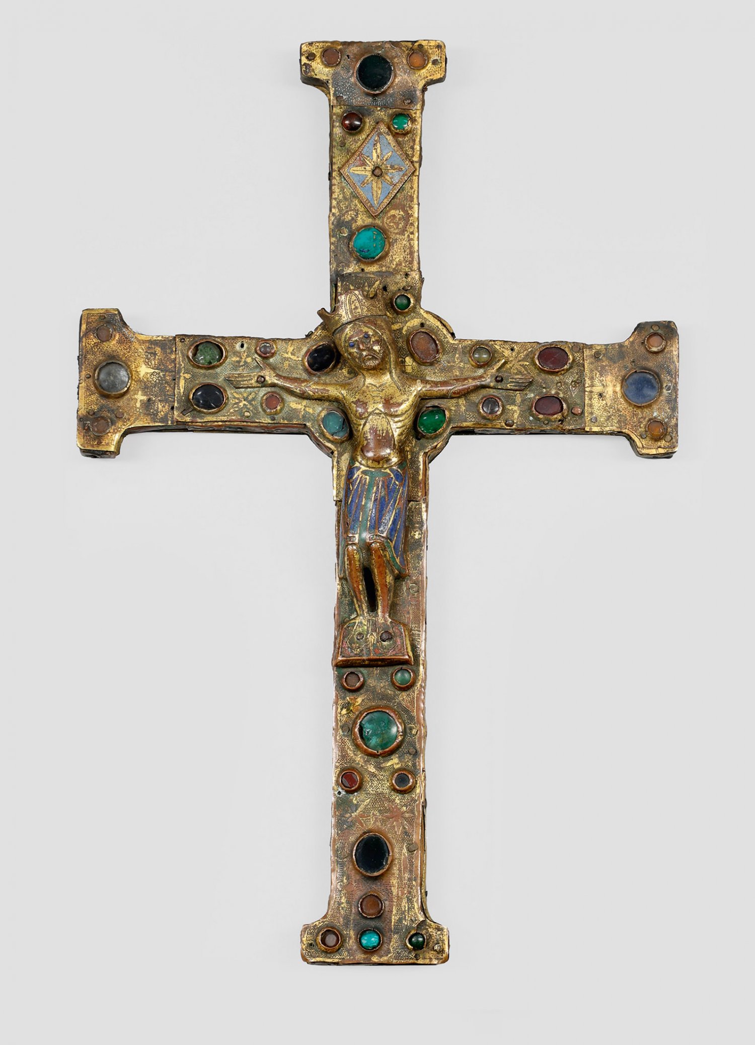 Museales Limoges-Prozessionskreuz Holzkern, beschlagen mit ziseliertem, punziertem und vergoldetem Kupfer, auf der Vorderseite reich besetzt mit ovalen und runden Glascabochons und einer Champlevé-Email-Plakette; der rücks. hohle Corpus Christi in Kupfer, partiell ziseliert bzw. getrieben, vergoldet und emailliert. Das Kreuz mit akzentuierten Kreuzendungen, auf Vorder- und Rückseite mit flächendeckendem Dekor aus Sternen. Der Gekreuzigte im Viernageltypus mit langem, blau emailliertem Lendentuch und blauen, eingelassenen Augen, die Arme horizontal ausgebreitet, den gekrönten, großen Kopf zu seiner rechten Seite geneigt. Dieses museale Prozessionskreuz gehört zu der von Stohlman 1950 (op.cit.) als "Sterngruppe" bezeichneten Gruppe von Emaille-Objekten aus Limoges, die applizierte Figuren auf Metallgrund aufweisen und die mit Sternen und Cabochons gearbeitet sind. Weitere dieser Gruppe zuzuordnende Limoges-Prozessionskreuze befinden sich laut Stohlman im Musée de Cluny, Paris (Inv.-Nr. 985) und im Musée Mathon-Durand in Neufchâtel-en-Bray (Stohlman, Nr. 11). H. 38,5 cm; B. 25 cm.