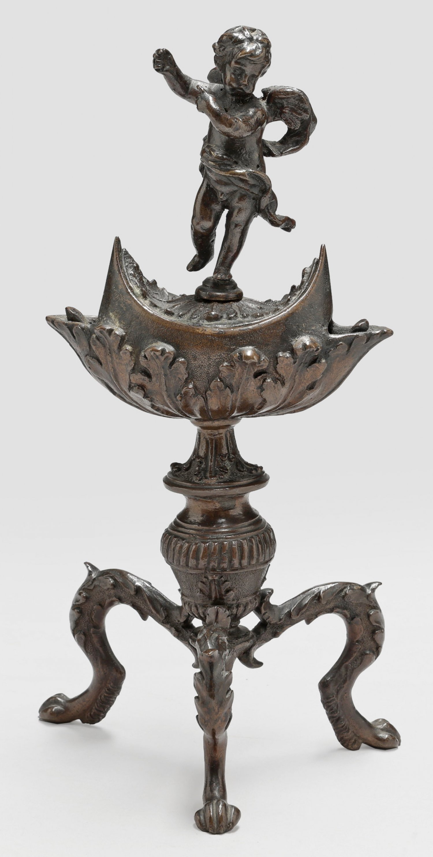 Renaissance-Öllampe Bronze, dunkelbraun patiniert. Auf drei Löwenbeinen stehender, balusterförmiger Schaft mit ovalem, mit Akanthusblättern besetztem Aufsatz mit seitlichen Öffnungen für die Dochte. Bekrönung durch einen vollplastischen, montierten Cupido mit Velum. H. 32 cm.