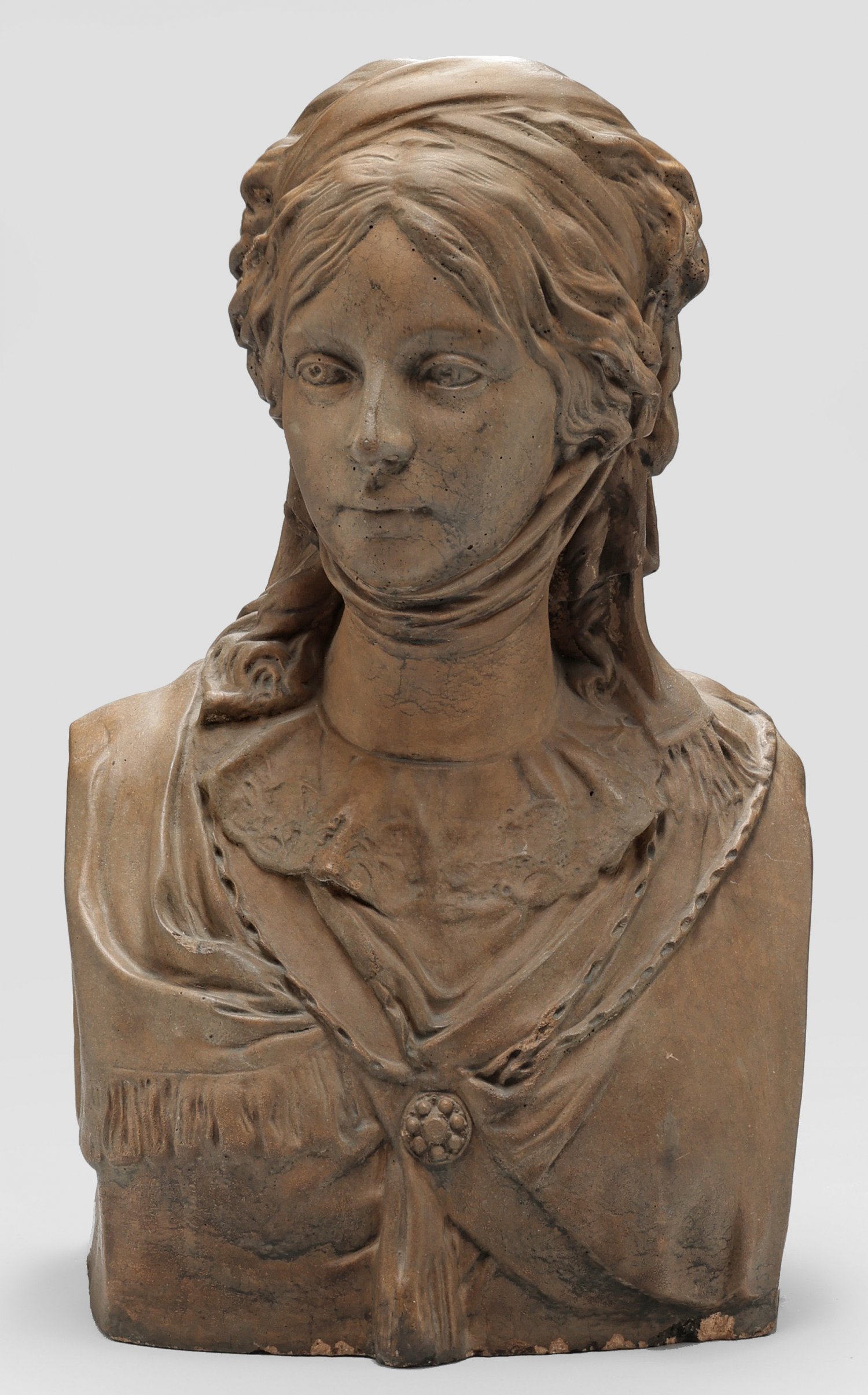 Steinguss, rotbraun gefasst. Lebensgroße, vollplastische Büste des 19. Jhs. nach dem Gips- bzw. Marmorvorbild von 1797/98, welches sich heute in der Nationalgalerie in Berlin befindet. Im Zusammenhang mit dem berühmten Doppelstandbild der "Prinzessinnengruppe" hatte Schadow auch zwei Gipsbüsten der Prinzessinnen geschaffen und auf der Akademieausstellung 1797 gezeigt. Für die Akademieausstellung im Jahre 1798 ließ er die Büste der Königin Luise ganz leicht verändert auch in Marmor ausführen. Ger. best. H. 56 cm.