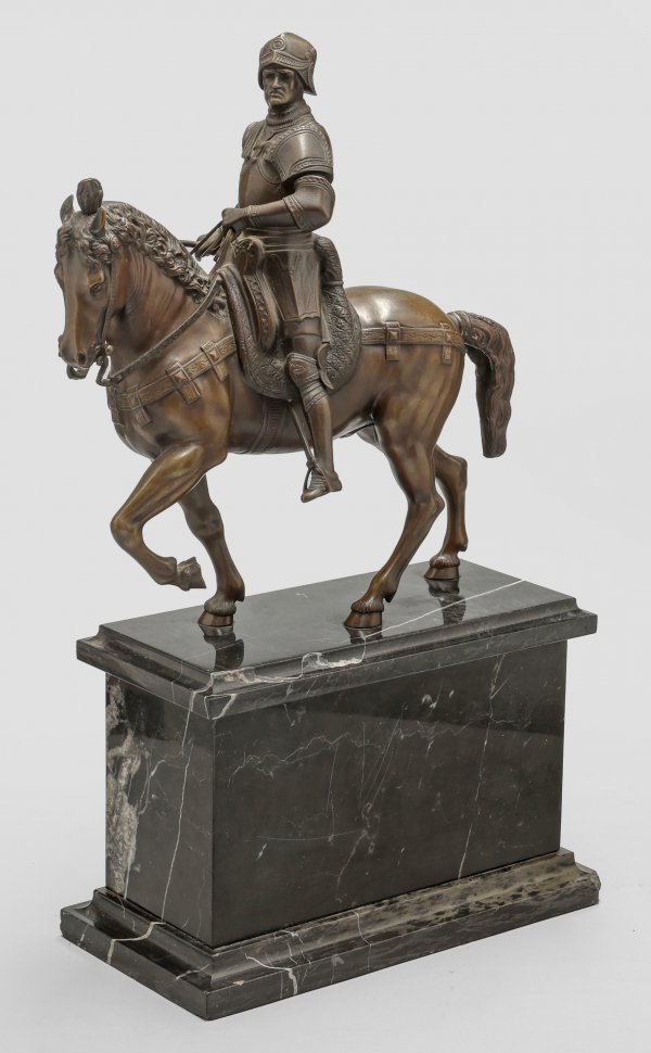 Bronze, dunkelbraun. Guss Italien, Ende 19. Jh.; Schwarzer Mamorsockel, best.: Verkleinerte Darstellung nach dem berühmten Reiterstandbild des Feldherren in Venedig. Ges.-H. 53,5 cm.