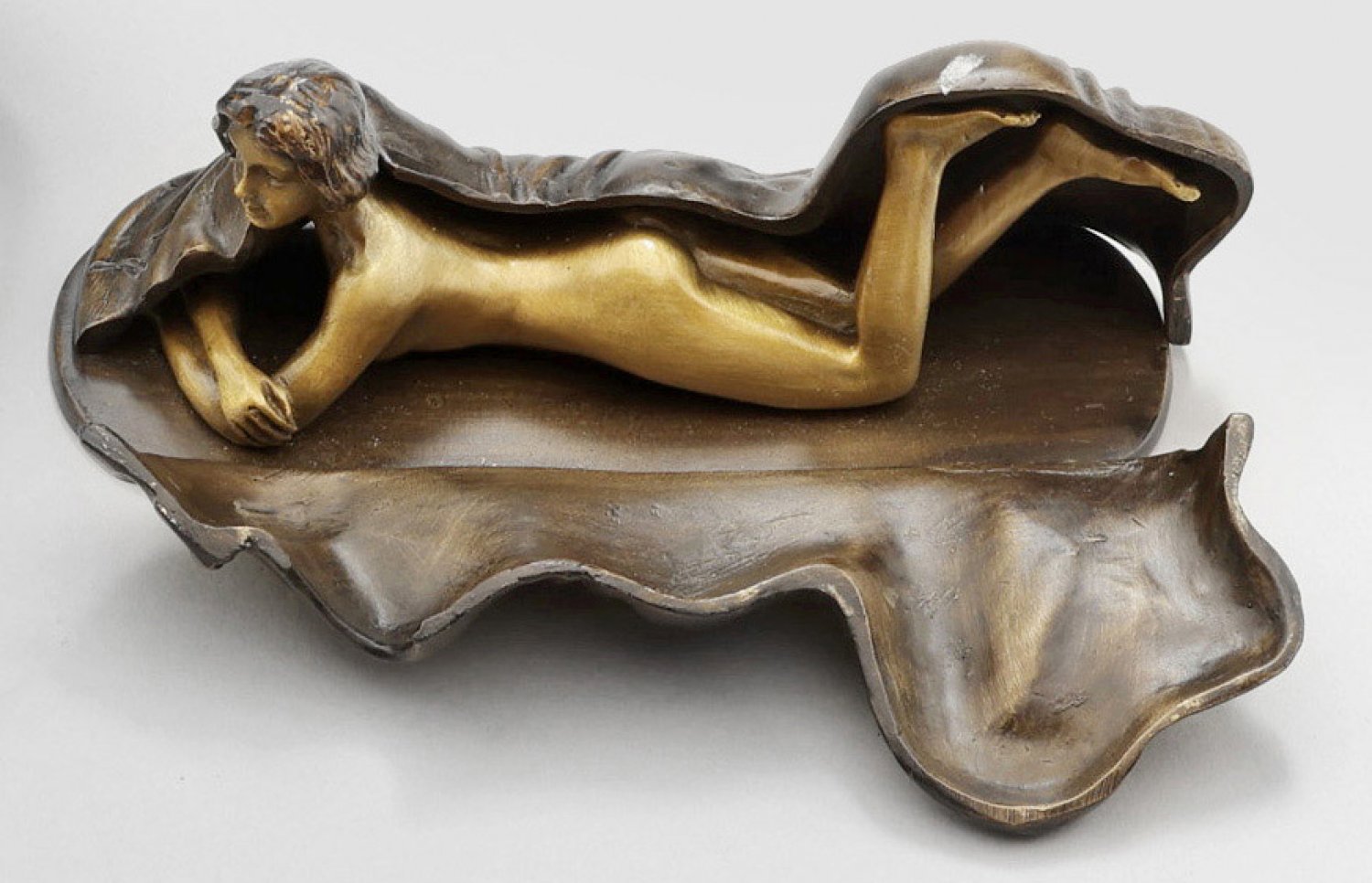 Erotische Verwandlungsfigur mit liegendem weiblichen Akt Bronze, dunkelbraun patintiert und partiell gebürstet. Durch ein durch Scharniere zu öffnendes, zweigeteiltes Tuch lässt sich die Figur in einen Akt verwandeln. Gem.; H. 5,3 cm; B. 14 cm.