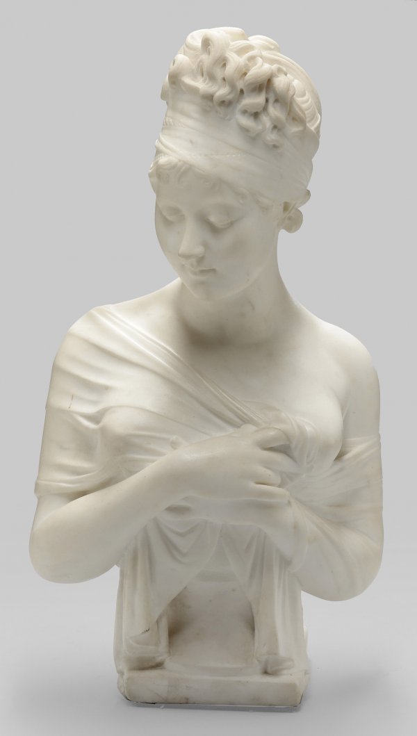 Weißer Marmor. Wohl im 19. Jh. entstandene, subtil ausgeführte, nach der berühmten 1804-1808 entstandenen Marmorbüste, die sich seit 1909 im Musée des Beaux-Arts in Lyon befindet. Diese ist sowohl eine der bekannten Büsten der Madame Récamier als auch eine der bedeutendsten Büsten des Bildhauers. Chinard schuf 1795/96-1812 mehrere Porträtbüsten von Juliette Récamier in unterschiedlichen Materialien. Die Büste in Lyon entstand zu der Zeit, als Chinard ab 1805 einige Zeit im Haus von Juliette Récamier lebte und als jene eine Liaison mit Prinz August von Preußen hatte. Am Sockel best.; H. 63 cm.