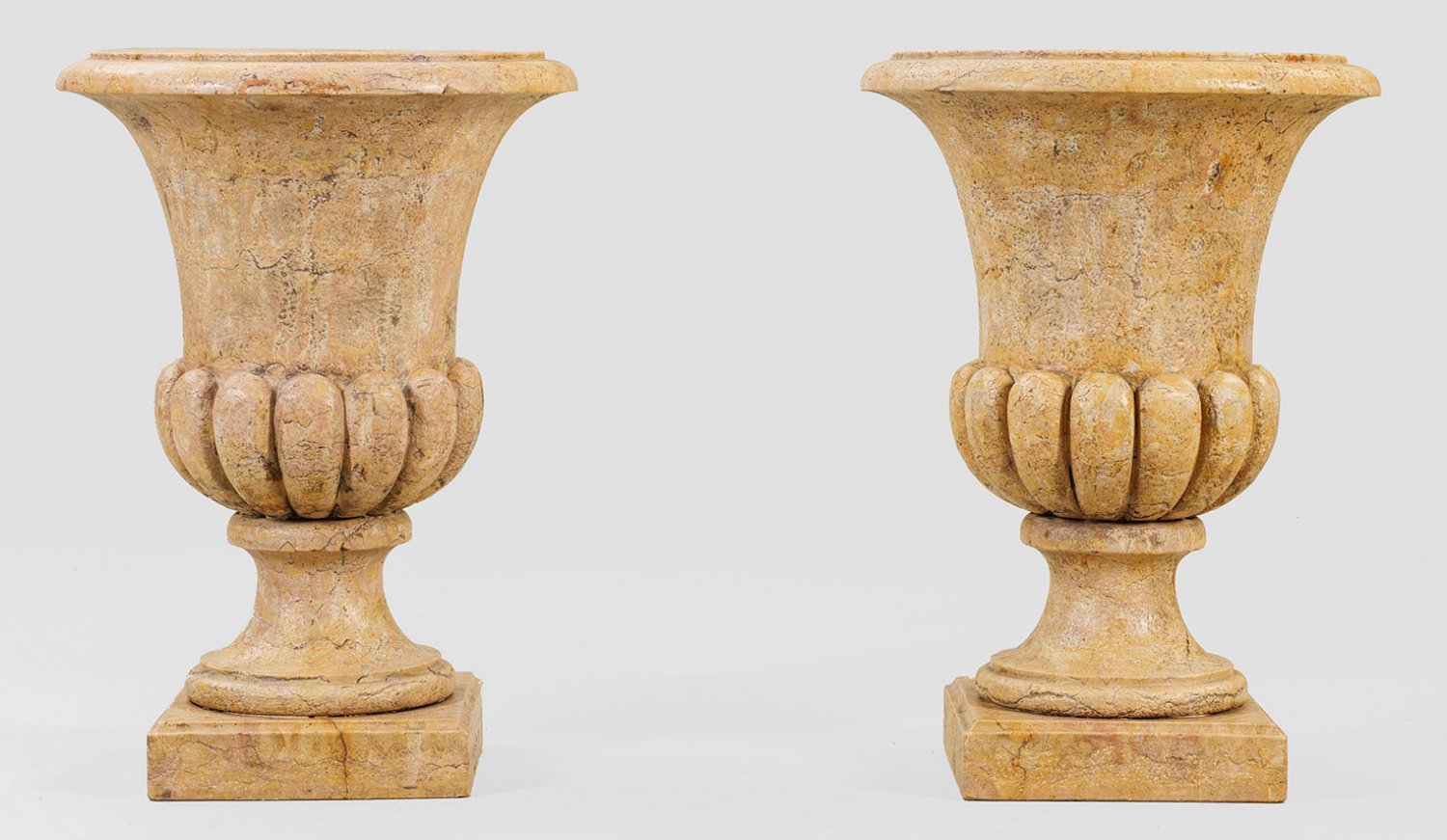 Paar große klassische Parkvasen Beigefarbener, gelb- und roséfarben gemaserter Marmor. Balusterförmiger, teilw. kräftig godronierter Korpus mit weit ausladendem, profiliertem Lippenrand auf quadratischer Plinthe. H. 75 cm. D. 53 cm.
