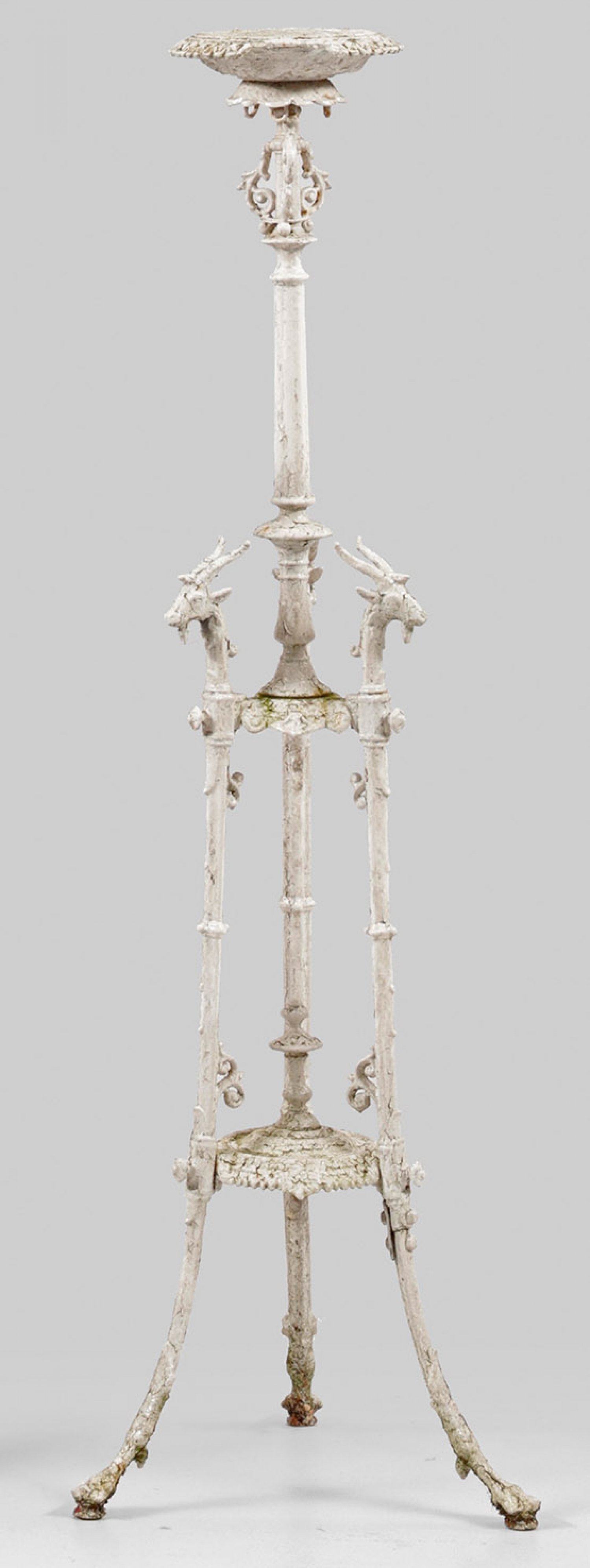 Guéridon Gusseisen, weiß lackiert. Offen gestaltetes Gestell aus geschweift ansteigenden Profilstreben mit Bocksköpfen. Oberhalb davon ausgehend mehrfach gegliederter Balusterschaft mit flachem, besch. Schalenaufsatz. H. 119 cm.