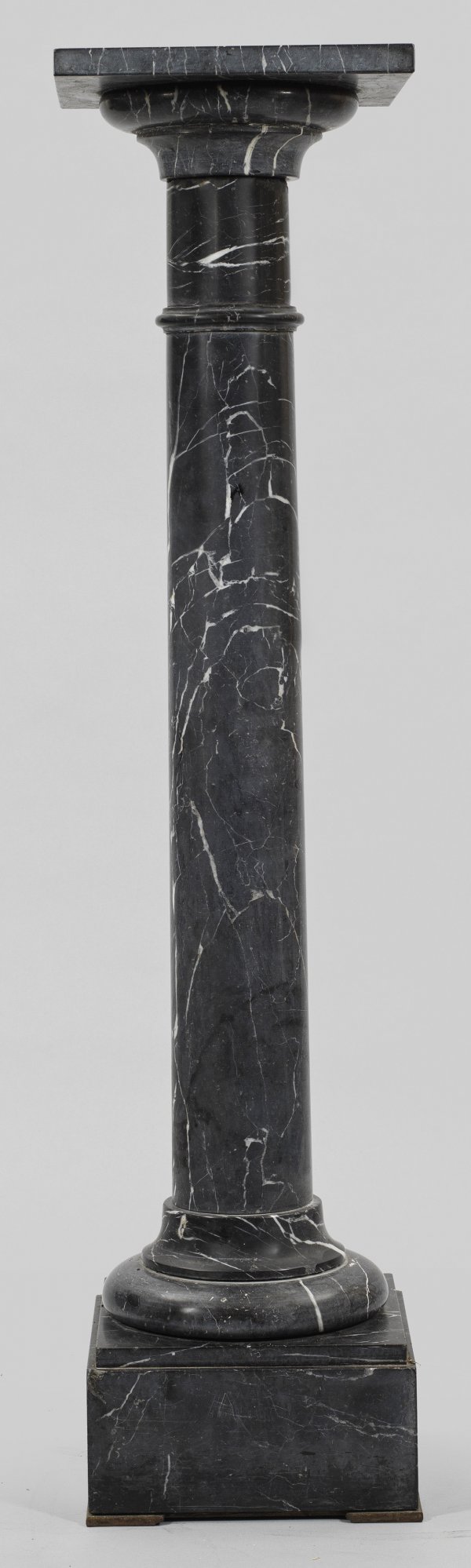 Skulpturensäule Dunkelgrauer, weiß gemaserter Marmor. Über quadratischem Sockel leicht konisch verlaufender Säulenschaft mit profilierter Basis und entsprechendem Kapitell als Träger für drehbare Deckplatte. Minim. besch.; H. 116 cm. 28 cm x 28 cm.