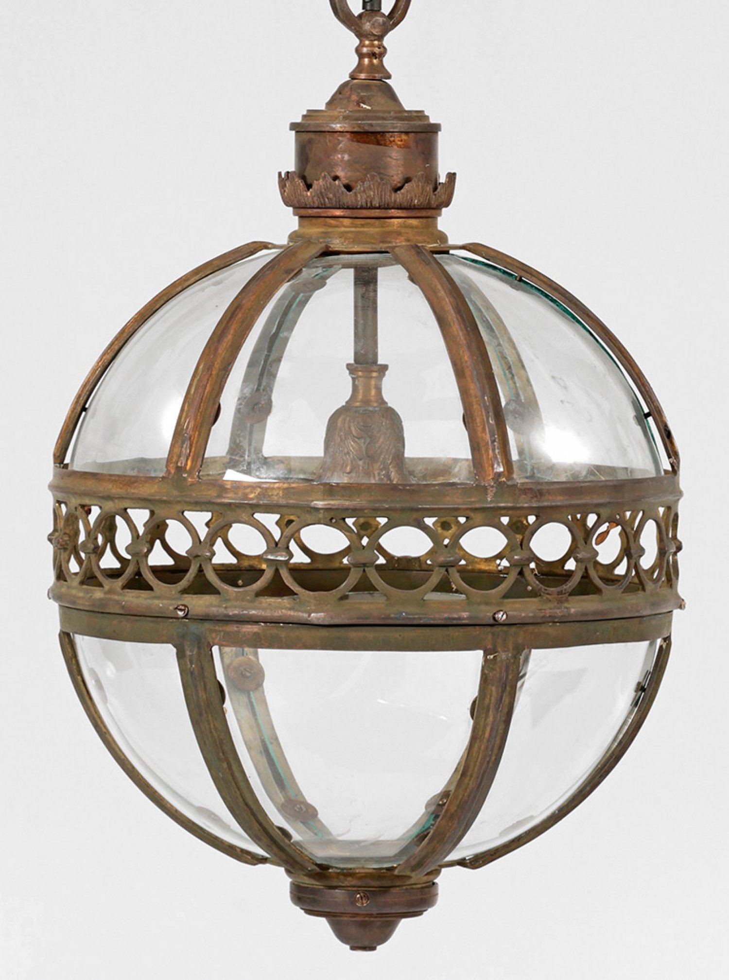 Deckenampel 1-flg.; Bronze, patiniert. Kugelförmiger Korpus aus gebogten Profilstreben sowie durchbrochen gearbeitetem Reif für bombierte Glaseinsätze. Innen eine Lampenfassung. Elektrifiziert. H. 68 cm. D. 40 cm.