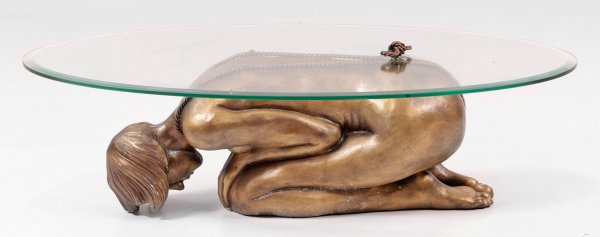 Bronze, in verschiedenen Brauntönen patiniert. Vollplastische Darstellung einer knienden, gefesselten, weiblichen Aktfigur als Träger für eine ovale Glasplatte. Sign. u. nummeriert 26/300. H. ca. 40 cm. Platte ca. 140 cm x 81 cm.